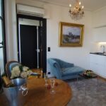 The built-in fully equipped kitchen includes; a separate fridge and freezer, a washing machine/dryer unit, convection hot plates, microwave oven, toaster, and a coffeemaker. It offers the perfect ‘no fuss’ kitchen for preparing snacks and light meals during your stay. Imagine yourself enjoying convivial conversations over a bottle of champagne or good wine while preparing a romantic dinner for two seated on a cosy plush velvet ‘meridienne’. The dining area is further enhanced with two antique blue velvet armchairs and a pedestal cocktail table beneath an authentic crystal chandelier.