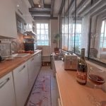 The living room area is set along the wall connecting with the kitchen which is raised with a glass window, increasing the feeling of conviviality. As for the seating arrangement, a large sofa seat comfortably three persons and is centered on a glass table and two Voltaire style armchairs. An old chest covered with cushions is facing the sofa for more comfort. It is ideal for a calm rest after a long day of cultural visits or sharing a drink before dinner. - The fully equipped kitchen is separated from the living room by a glass door. A long wooden worktop is facing the living room, the kitchen is set with a vitroceramic hob, microwave, oven and fridge, freezer, coffee maker, toaster and electrical kettle. All necessary cutlery, glassware and crockery are available in the built in cabinets.