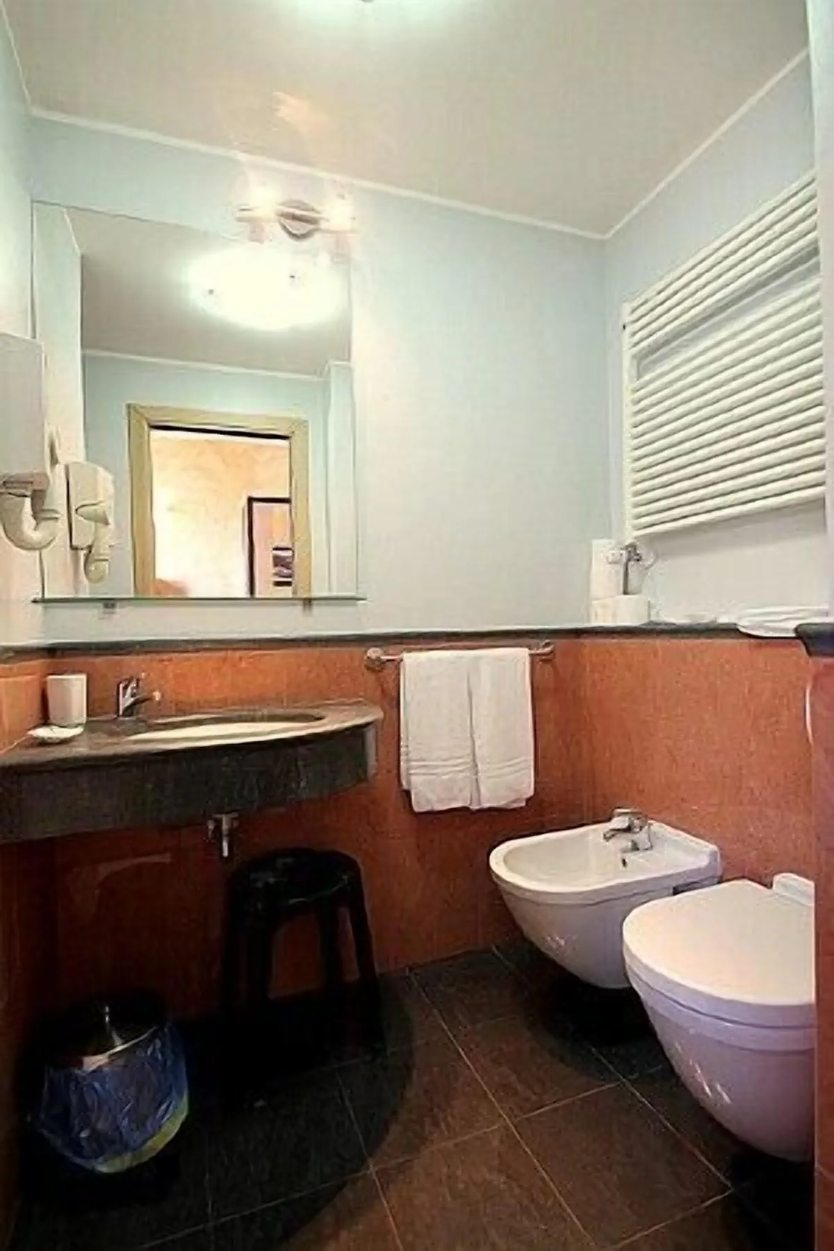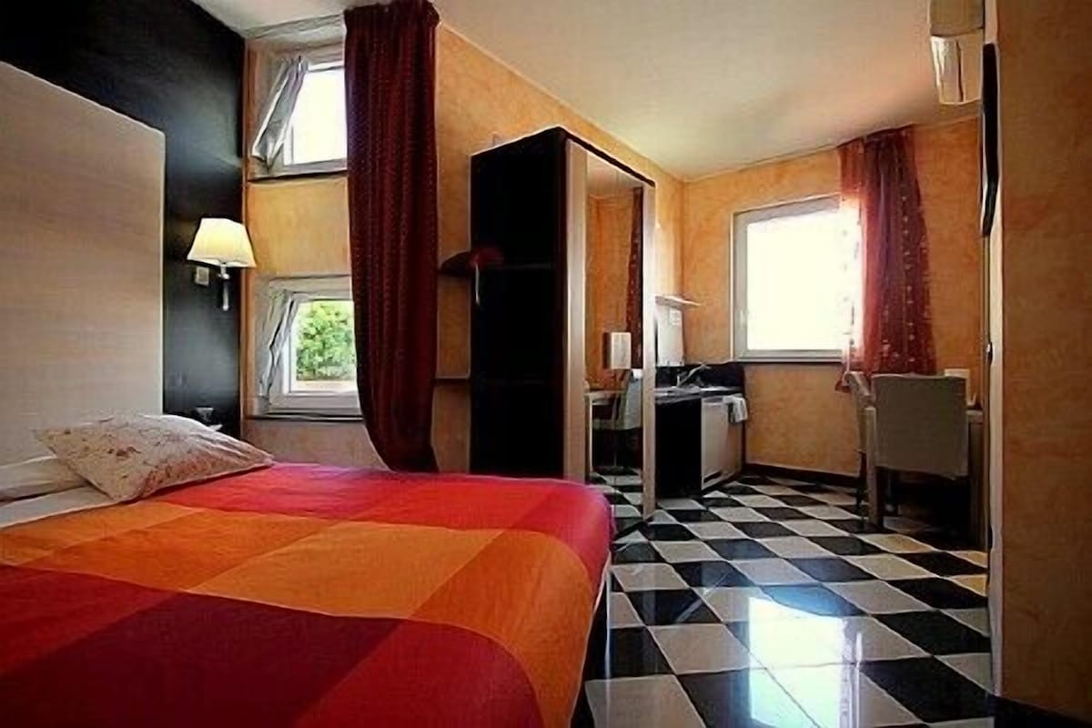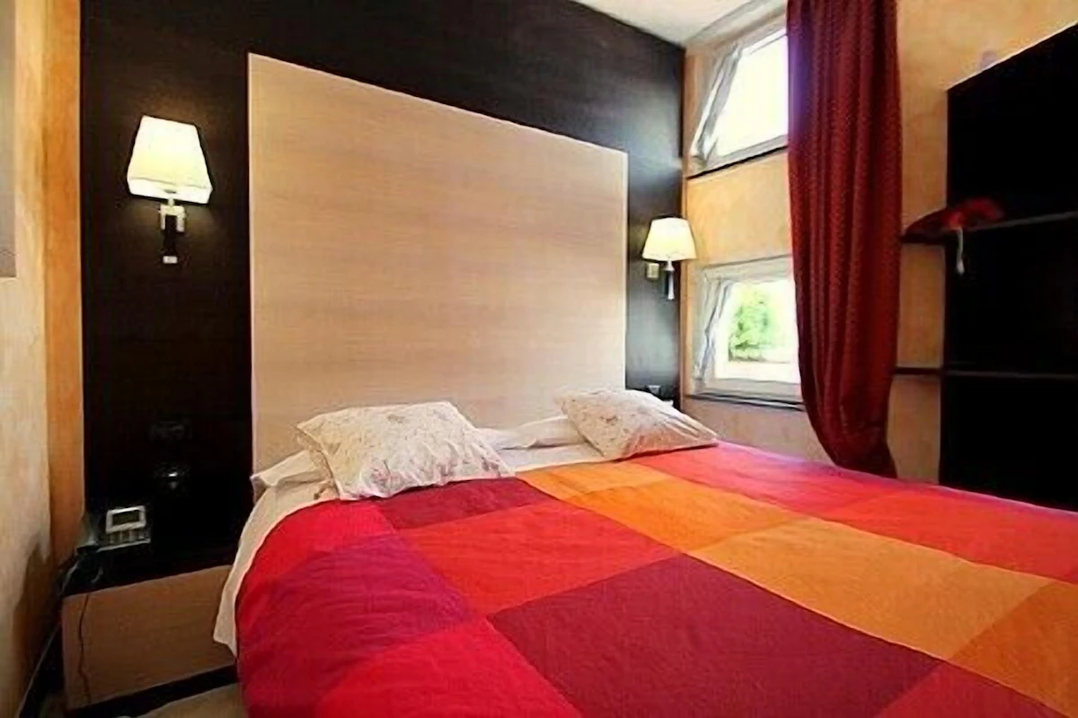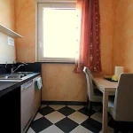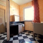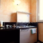 The furnishings of the living room are modern and welcoming. Here you will find a matrimonial bed (160 cm, wider than a queen-size bed). In the living room you will also find a cooking area. The kitchenette is equipped with a two-burner electric cooker, a small refrigerator with freezer and an Italian-style coffee-maker. The dining table can accommodate two guests. In this room you will find a television (local channels). The room has three double-glazed windows with a view of the garden and of the other buildings. It is equipped with an air conditioning/heating unit.