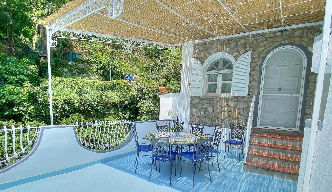 The terrace is 50 square meters (540 square feet) large. It is partly shaded by a characteristic pergola with a bamboo roof. It is equipped with a table and chairs. From the terrace you will enjoy a pleasant view of the greenery.