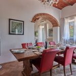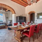 Dining table and chairs, cupboard, air conditioning, doors to terrace, terrace with outdoor living furniture.