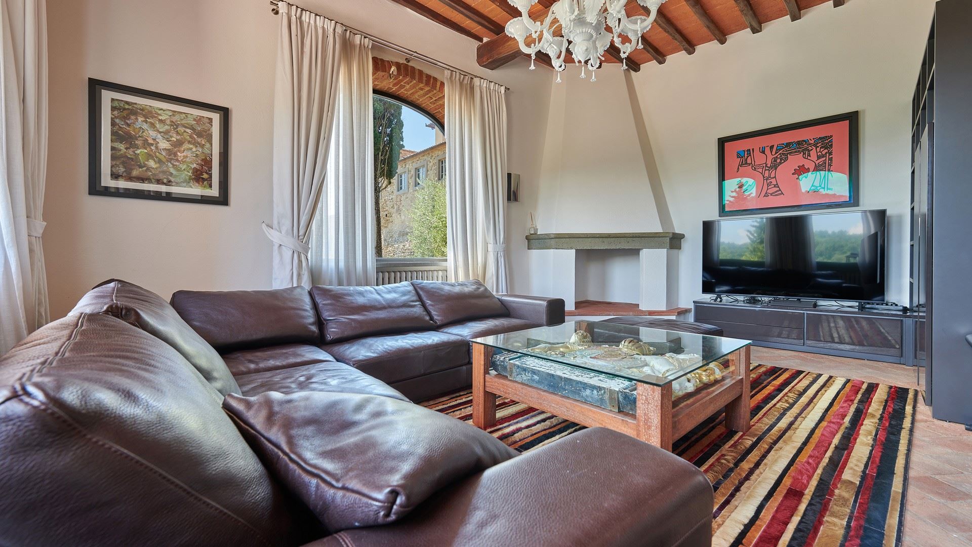 Corner sofa, coffee table, ottoman, smart TV, bookshelves, fireplace (decoration only), air conditioning.