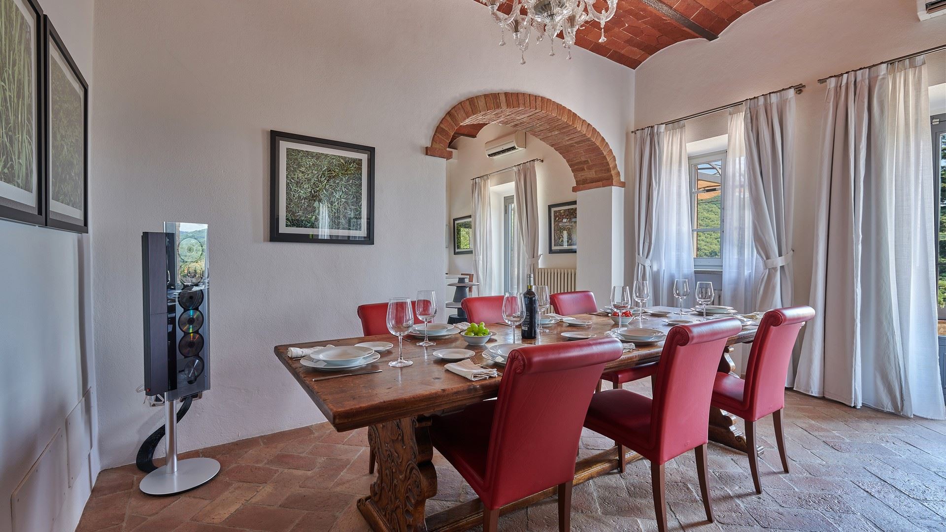 Dining table and chairs, cupboard, air conditioning, doors to terrace, terrace with outdoor living furniture.