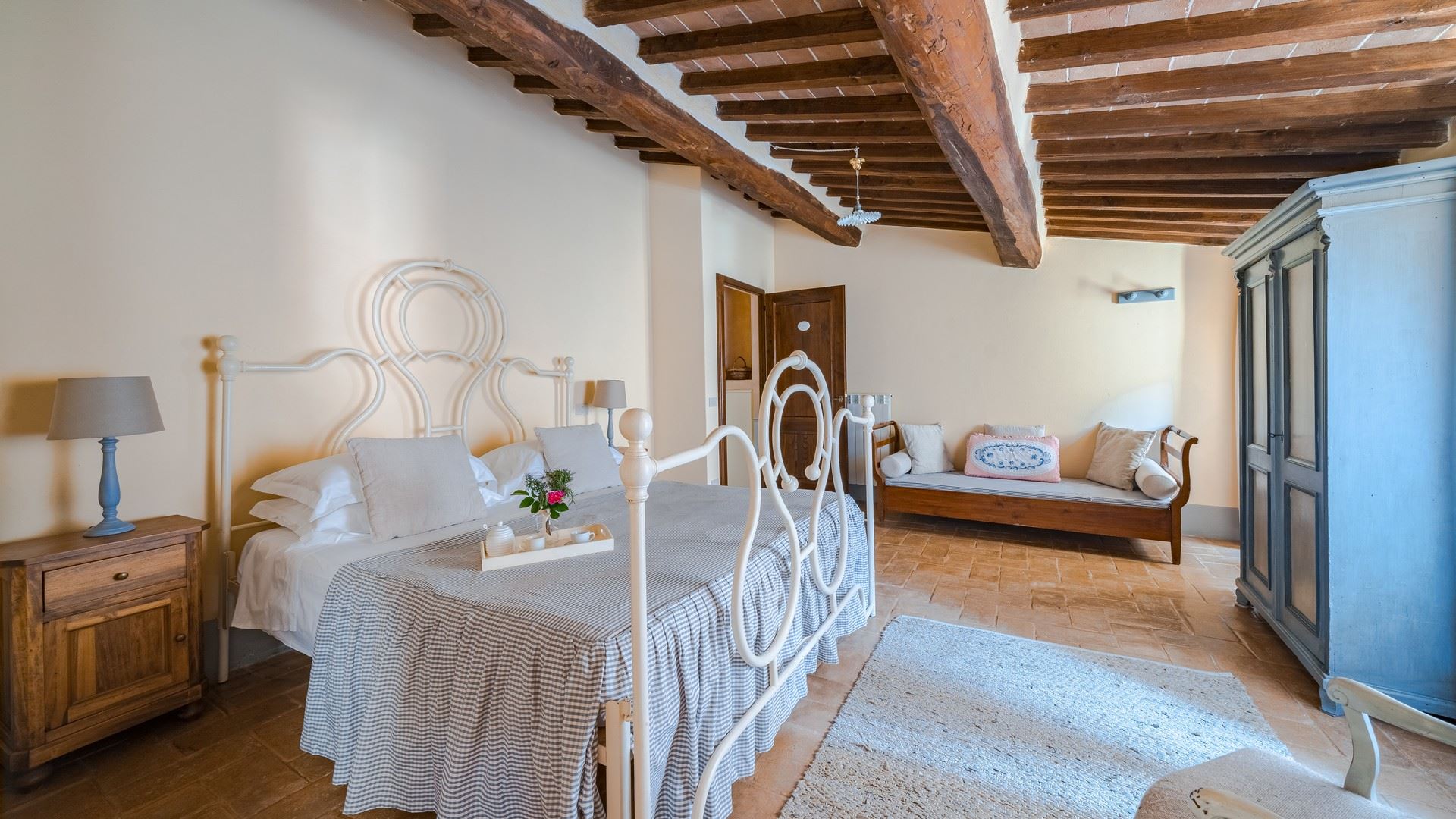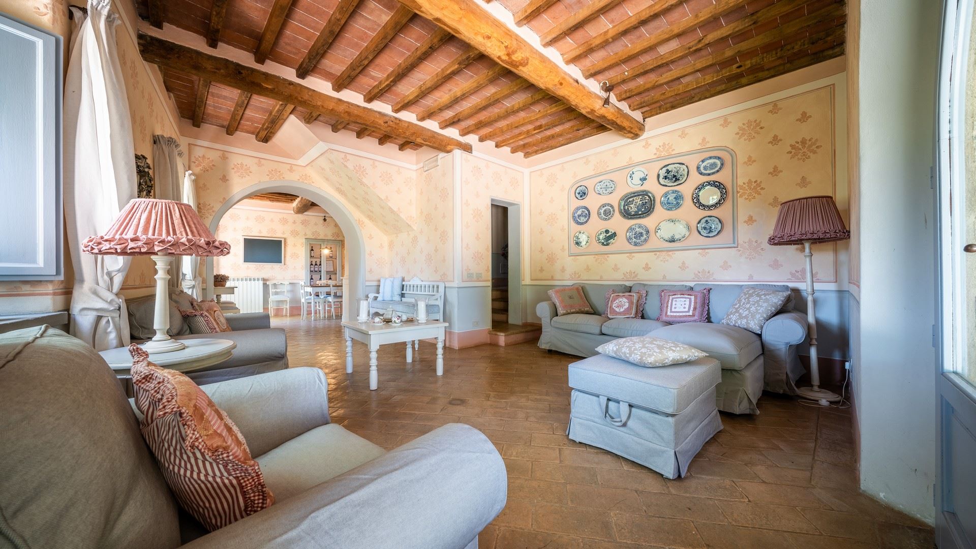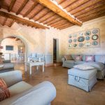 Interiors combine terracotta floors, wood-beamed ceilings, and soft-toned décor for a warm, elegant feel.