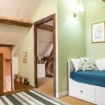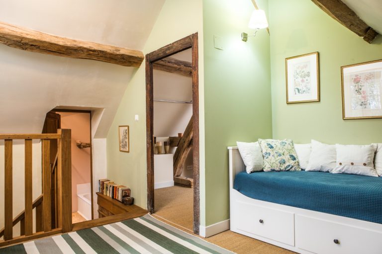 Upstairs, exposed oak beams throughout the bedroom and mezzanine sofa bed. Plus bathroom with bath and shower.