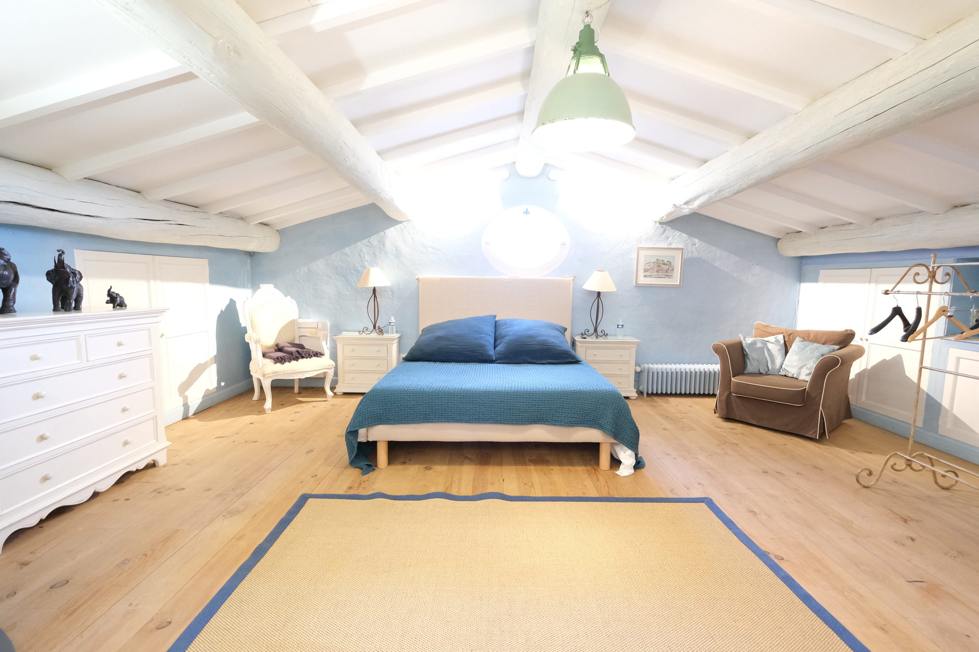 1 bedroom (35m²) with air-conditioning a king-size bed, adjoining bathroom (bathtub + shower + 2 sinks + toilet), TV, DVD, small stereo system.