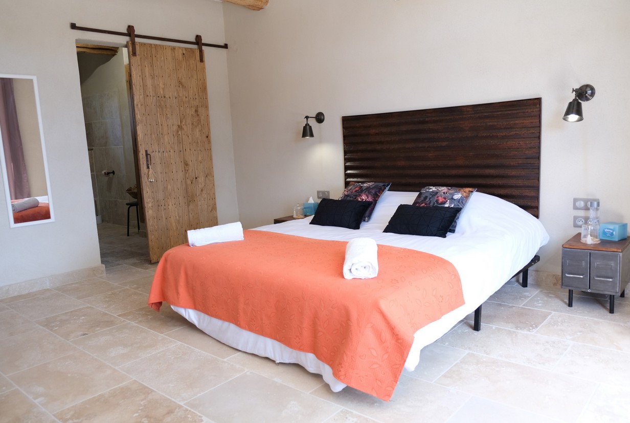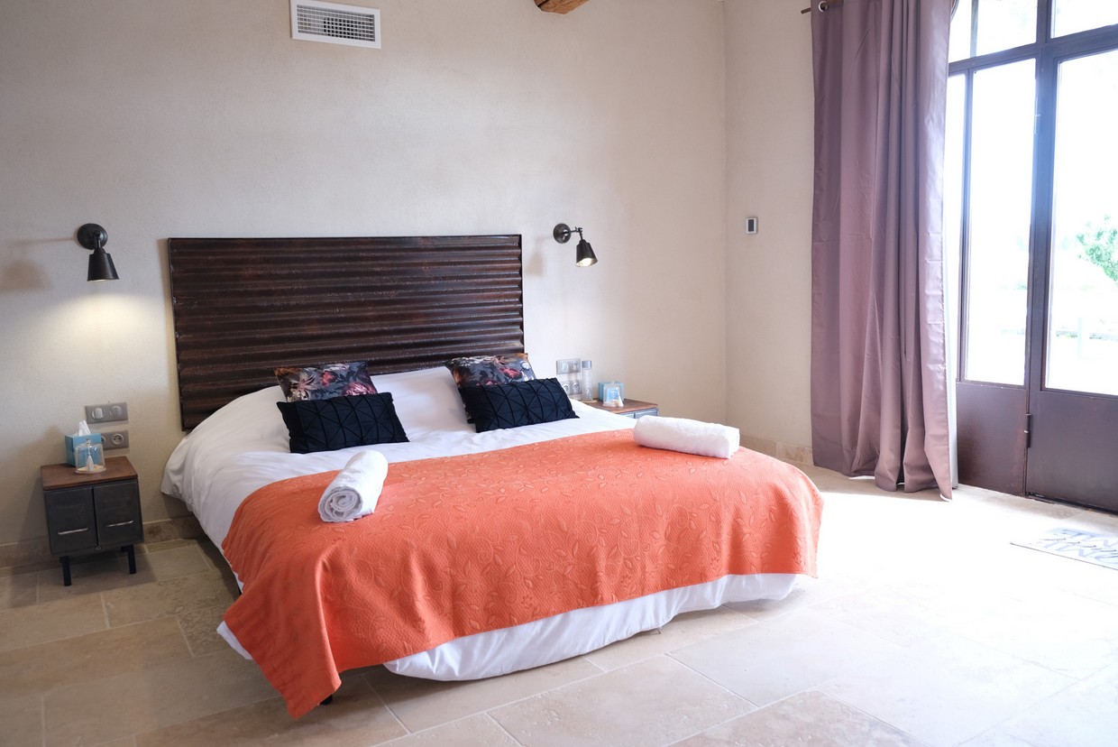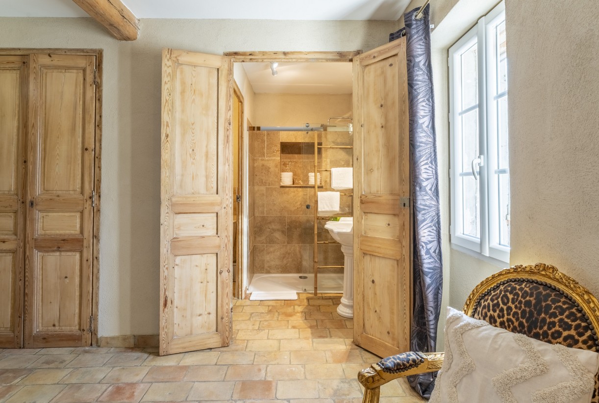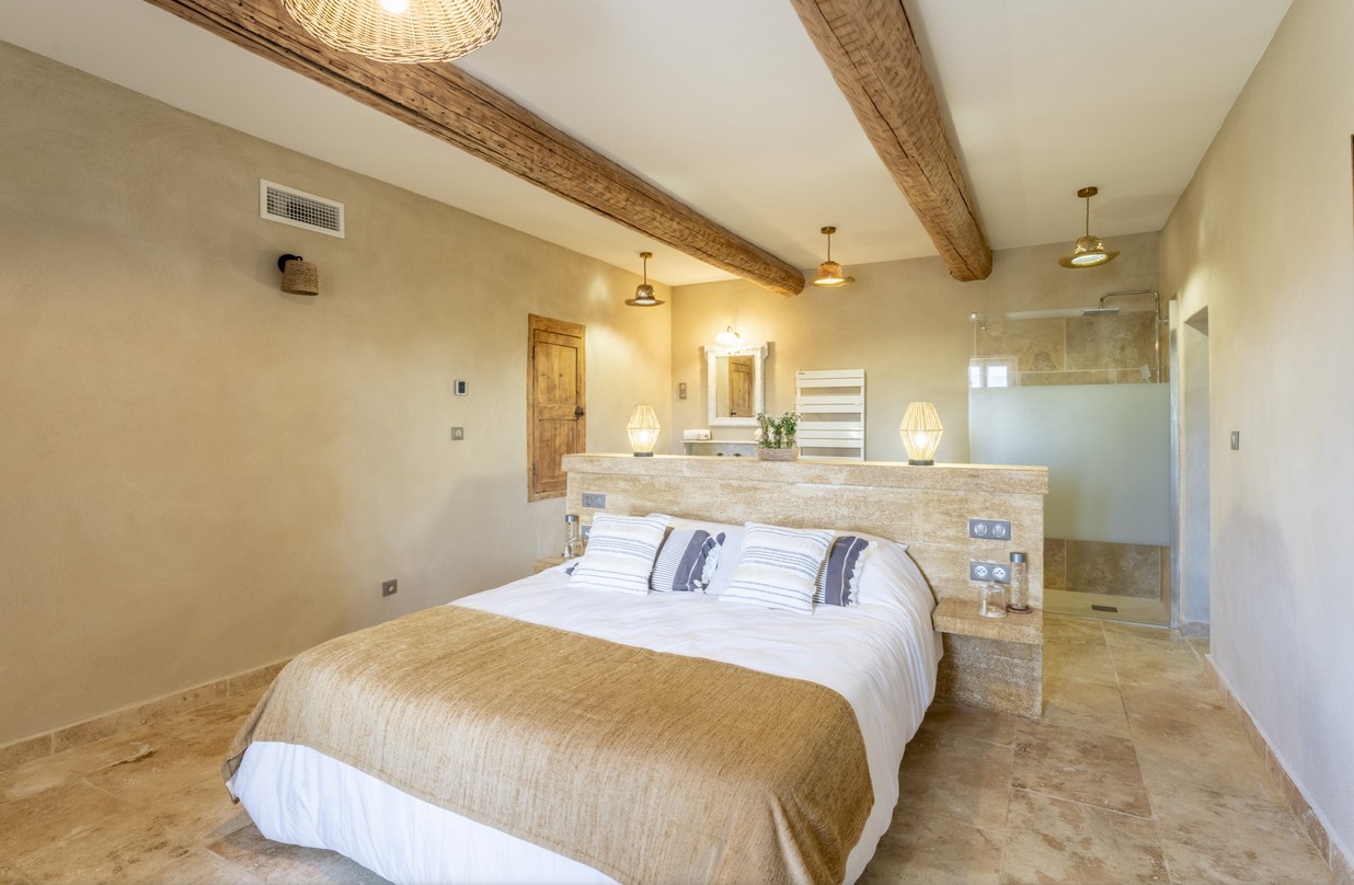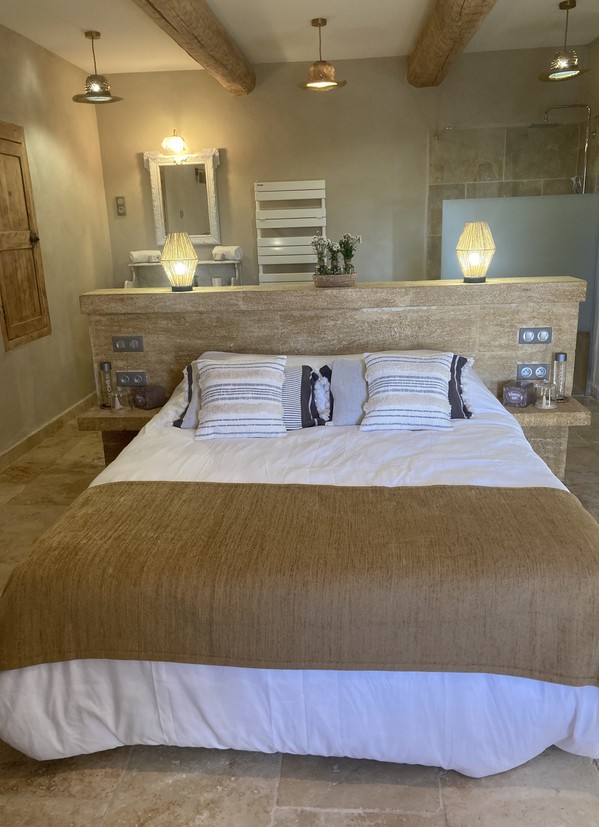 1 bedroom (25 m²) with an independent entrance to the main part of the mas, accessible from the pool area, with 1 double bed 180 and an adjoining bathroom (1 sink, 1 shower and WC)