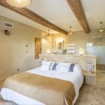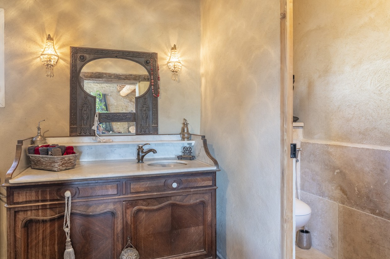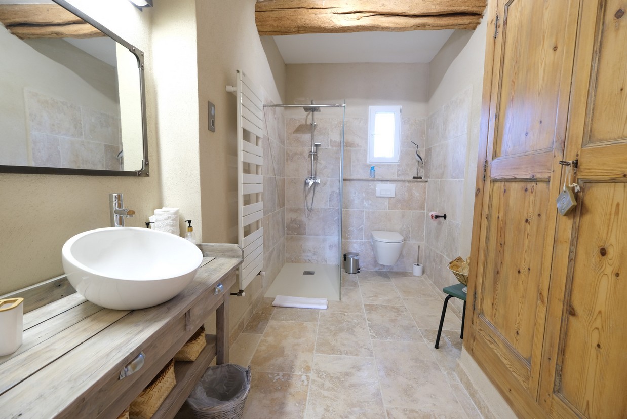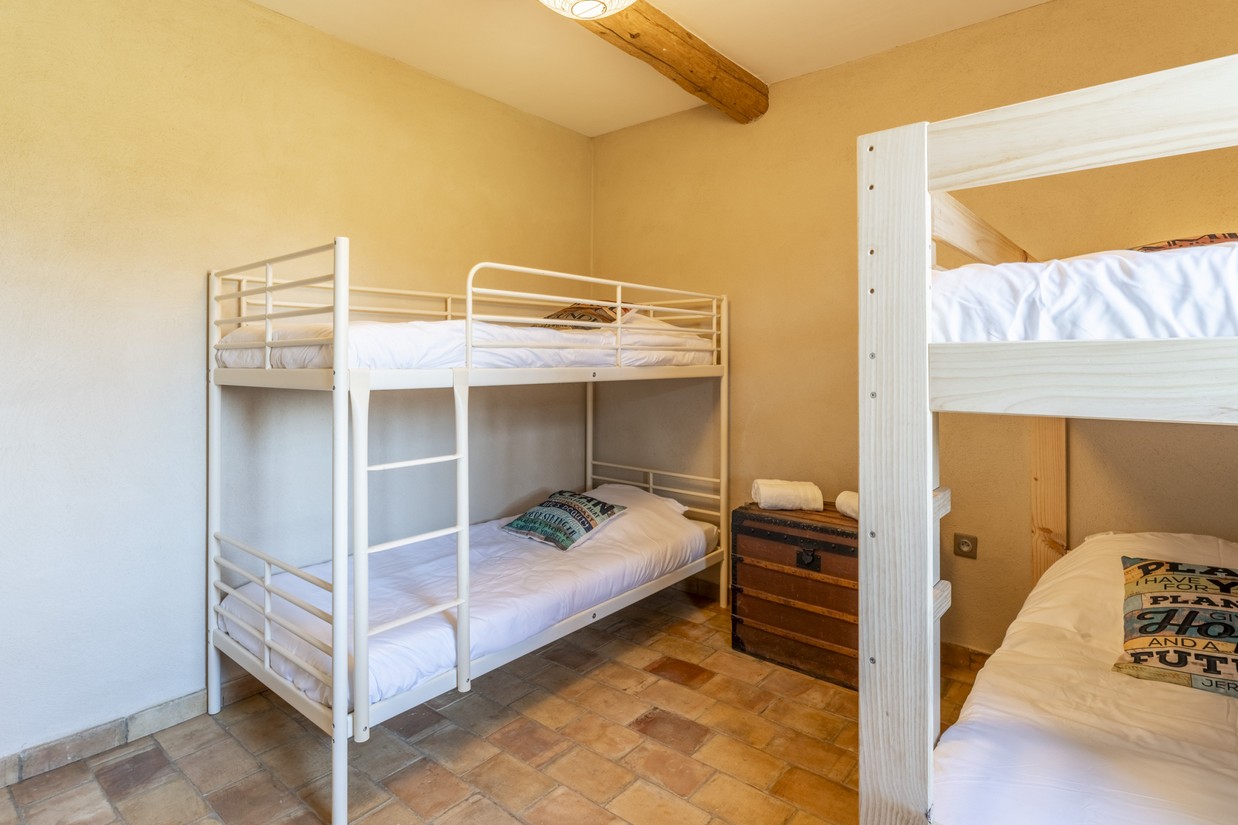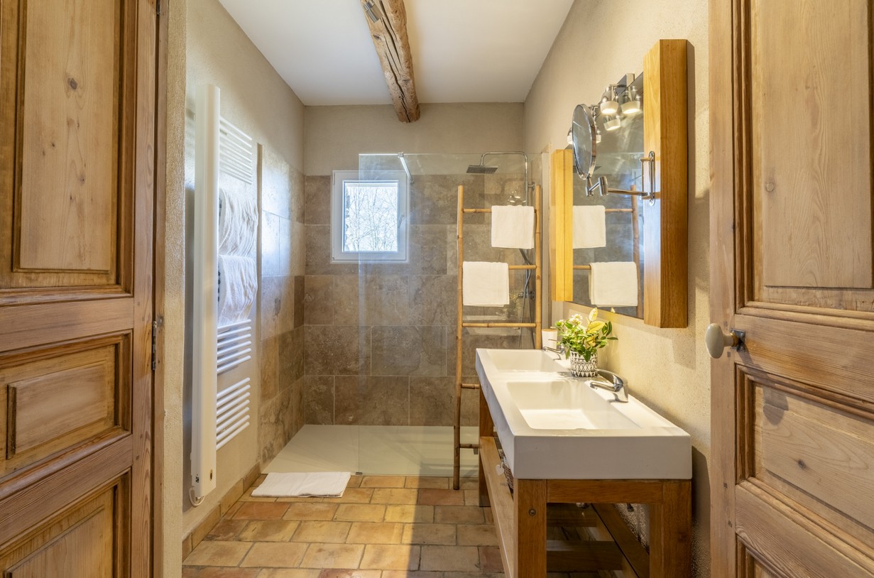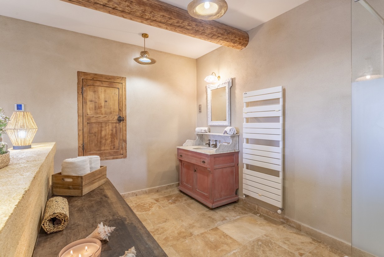 1 bedroom (25 m²) with an independent entrance to the main part of the mas, accessible from the pool area, with 1 double bed 180 and an adjoining bathroom (1 sink, 1 shower and WC)