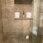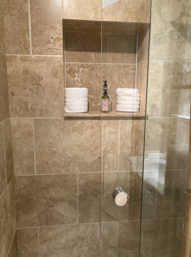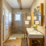 An independent bathroom with 2 basins, a shower and a hairdryer