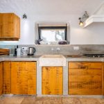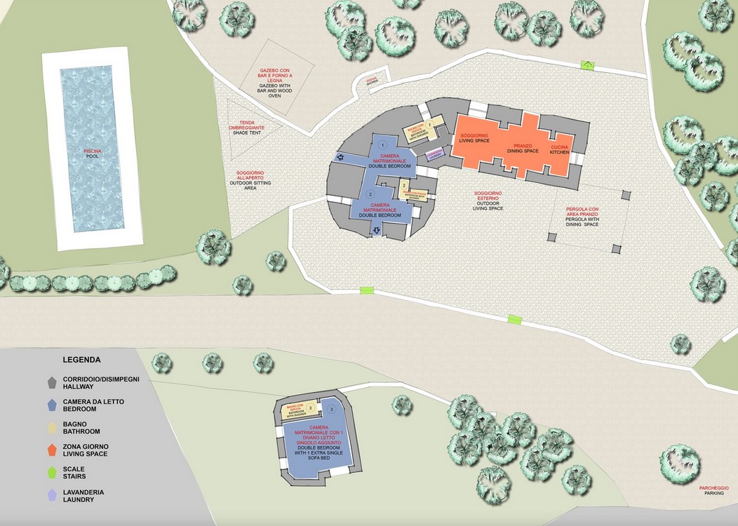 MAIN BUILDING – Living area with TV room and dining area; kitchen with direct access to the outdoor areas; laundry room; two double bedrooms with French-size beds (one through a connecting door to the other bedroom and one with direct access from outside); two bathrooms with shower (no bidet), one en-suite.