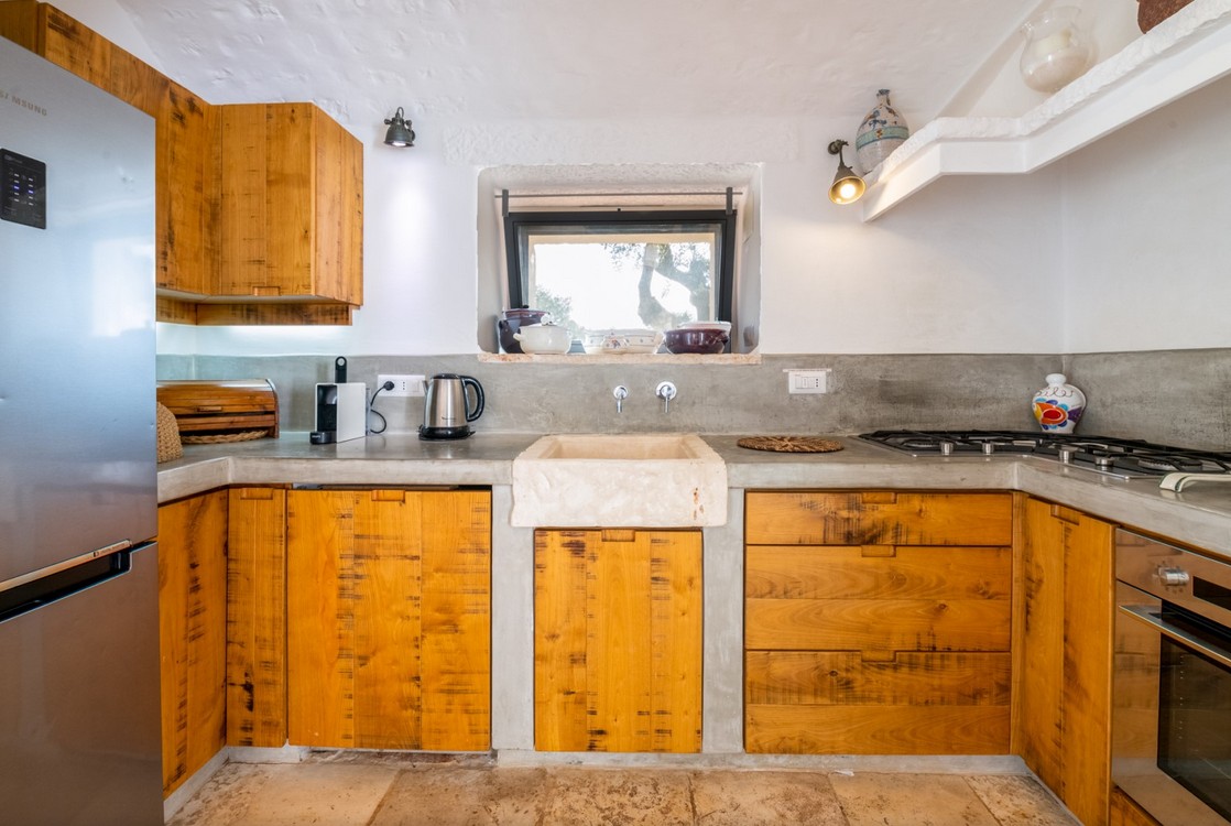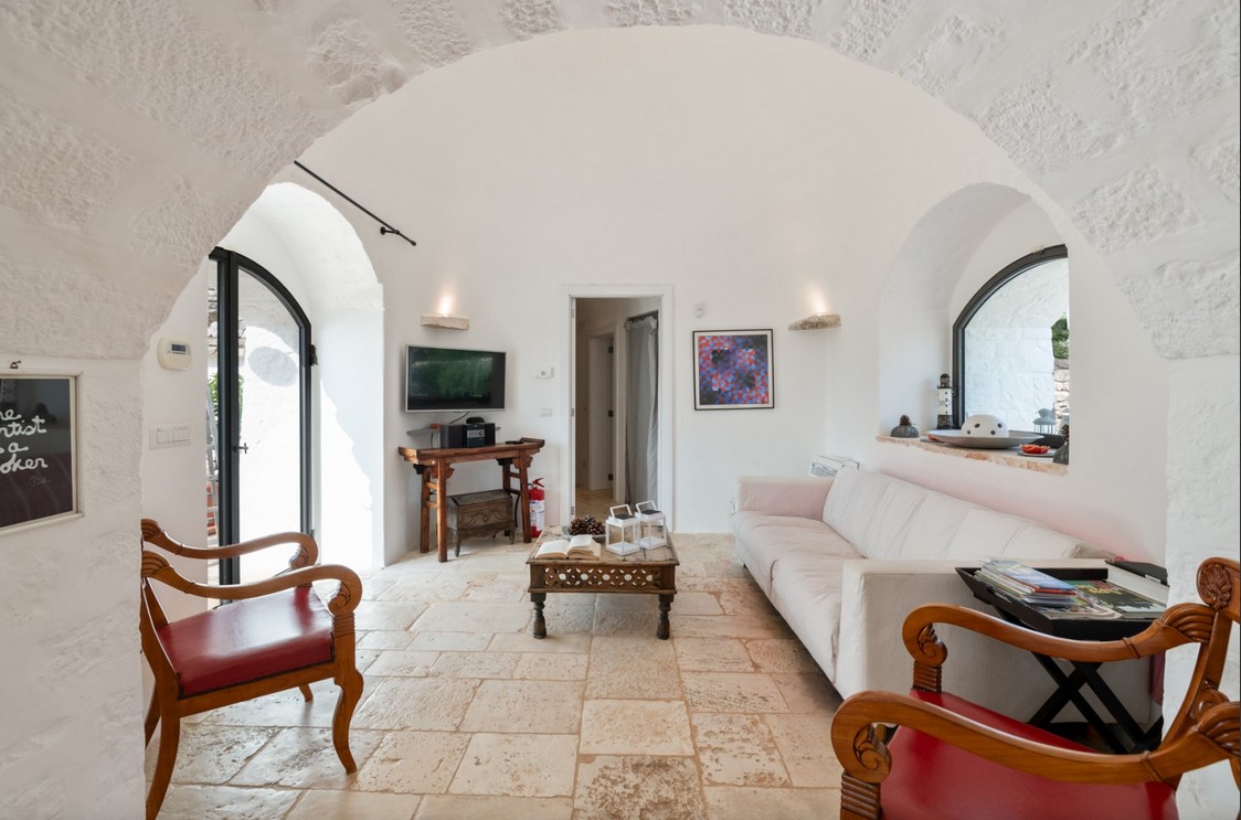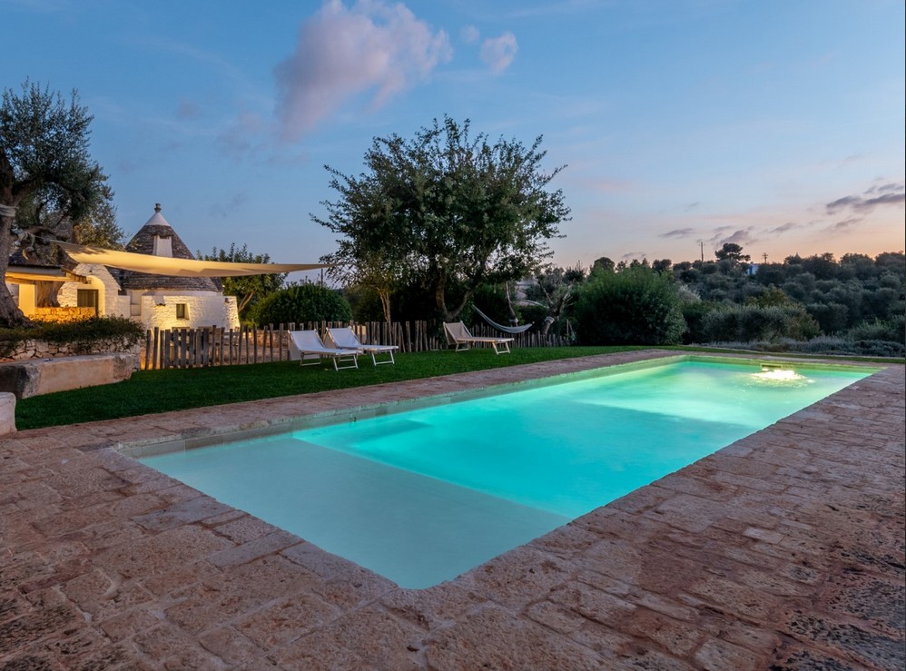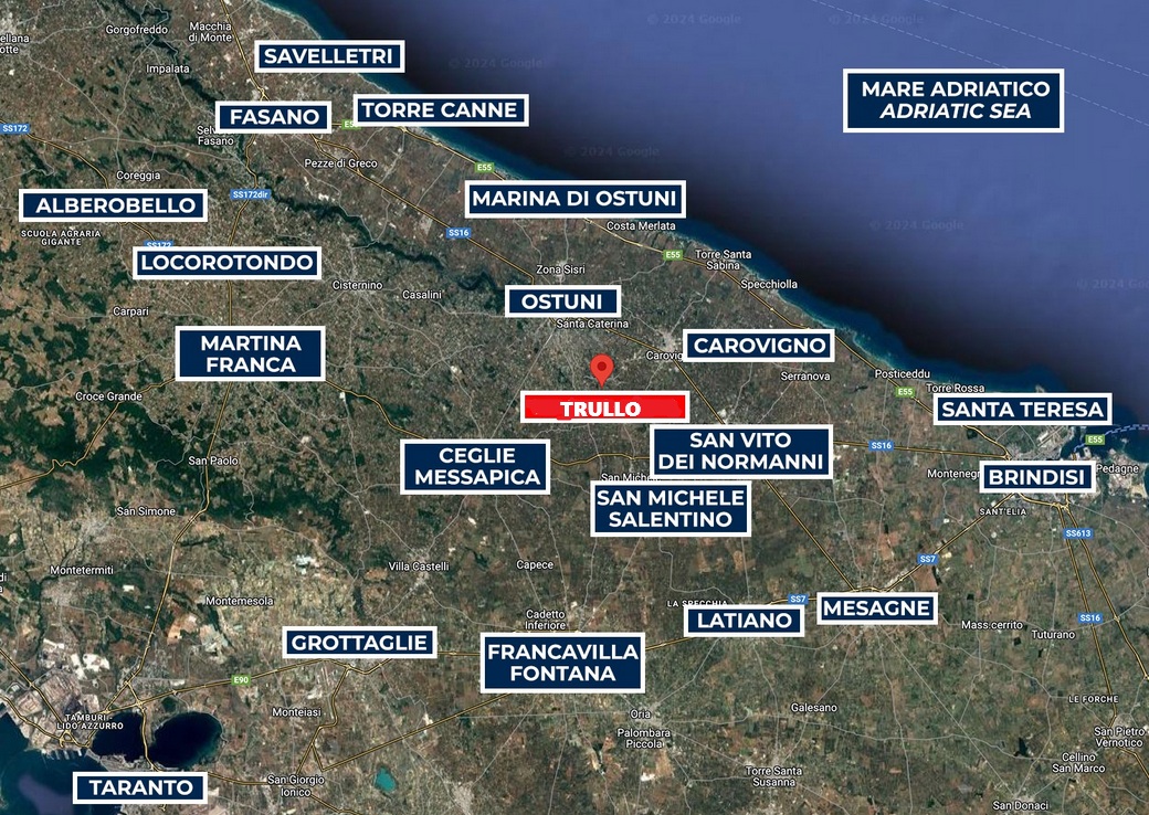 Approximately 4 km from the edge of Ostuni, known as the “White City,” offering a historic centre with restaurants and shops. Beaches such as Cala di Rosamarina and Torre Pozzelle are within 17–19 km. The location provides easy access to Lecce (76 km), Polignano a Mare (49 km), and the trulli of Alberobello (42 km). The nearest airport is Brindisi (44 km), with Bari airport 108 km away.