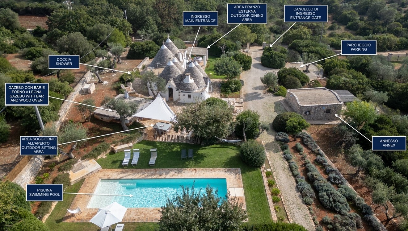 The property is on a single floor and consists of the main building (trullo = typical Apulian house with conic stone roof) and an annex (lamia = typical Apulian house) accessed via a stone walkway and steps.
