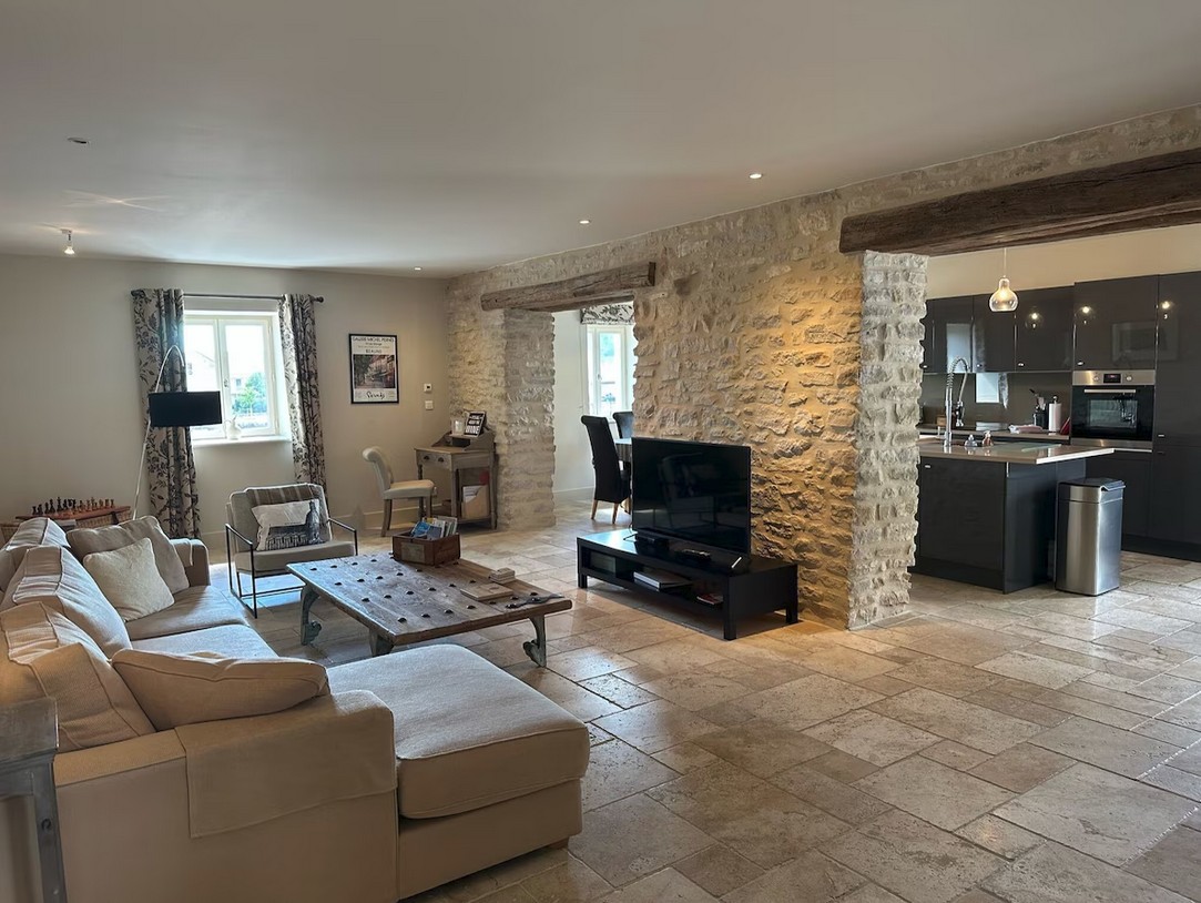 Living: the open plan living accommodation is downstairs, a extremely spacious. Renovated stone and original oak beams mix with relaxed modern colours, comfortable sofas, large HD TV with satellite channels and lots of wine books and novels.
