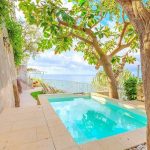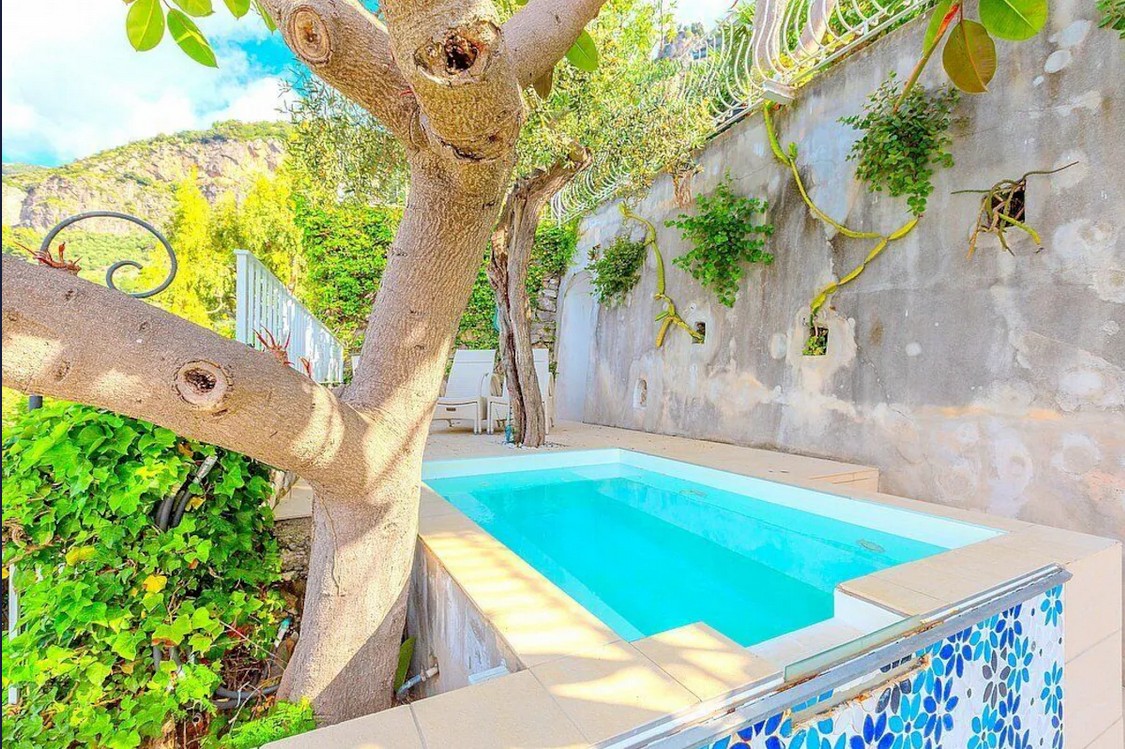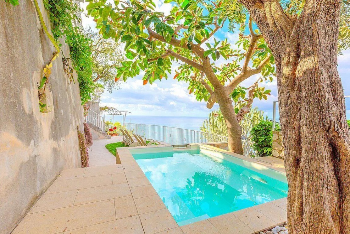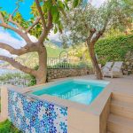 Terrace 1 features a non-heated jacuzzi pool with hydromassage (1.8 by 3 meters, 6 by 9.8 feet). It is partly shaded by tall trees. It is equipped with sun loungers and an external shower. From the terrace you will enjoy a fascinating view of the sea.