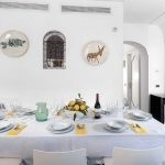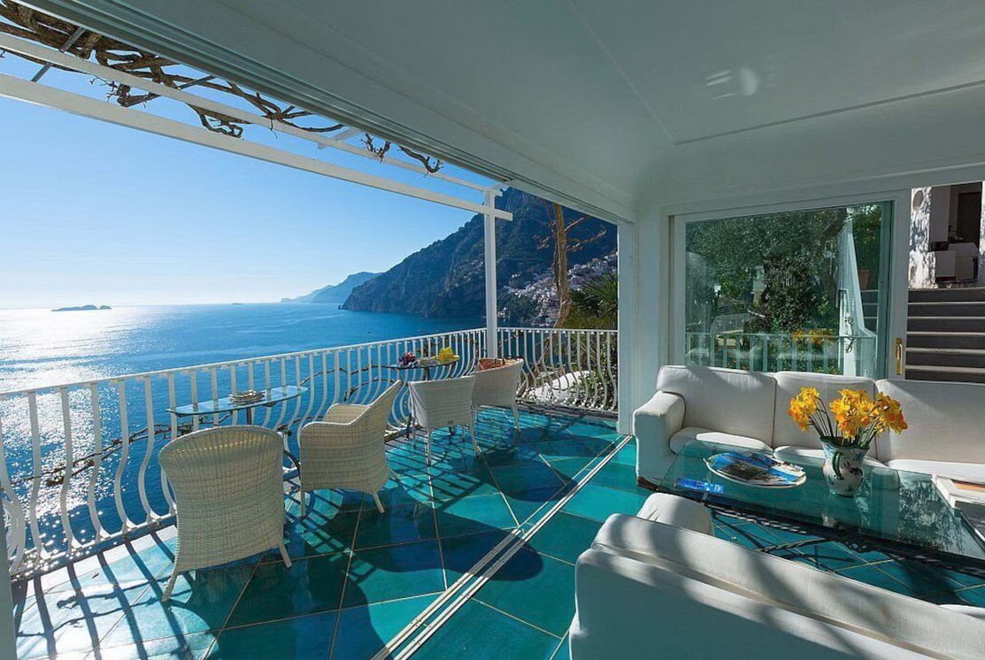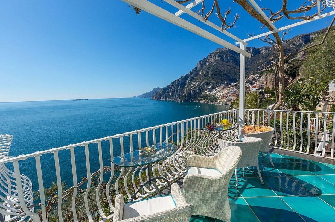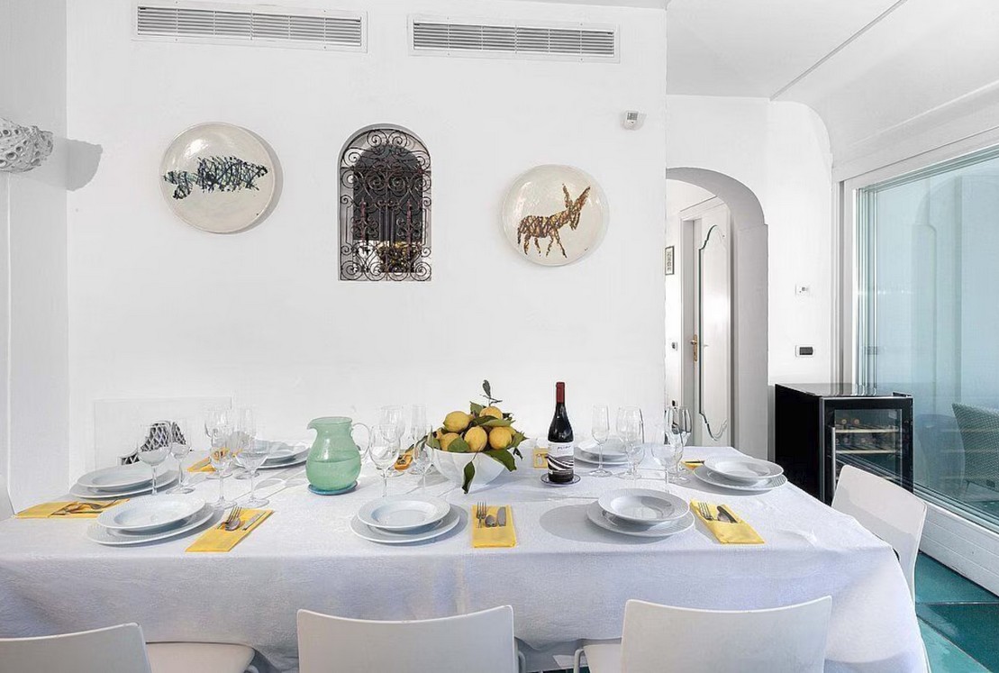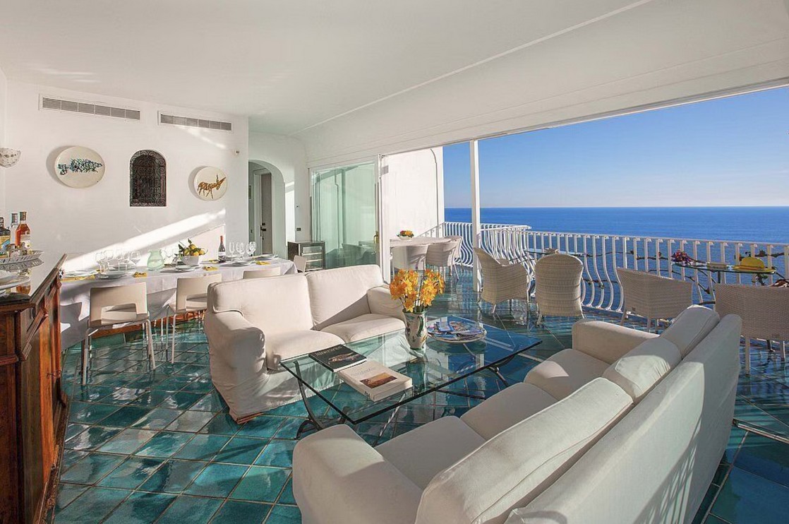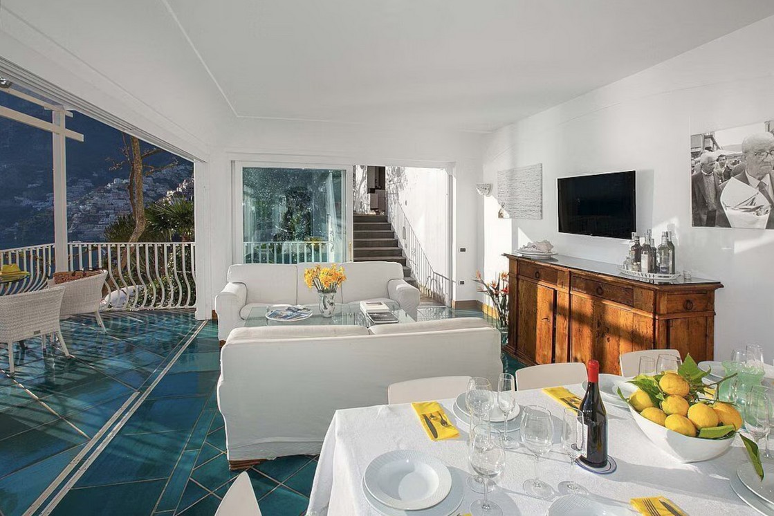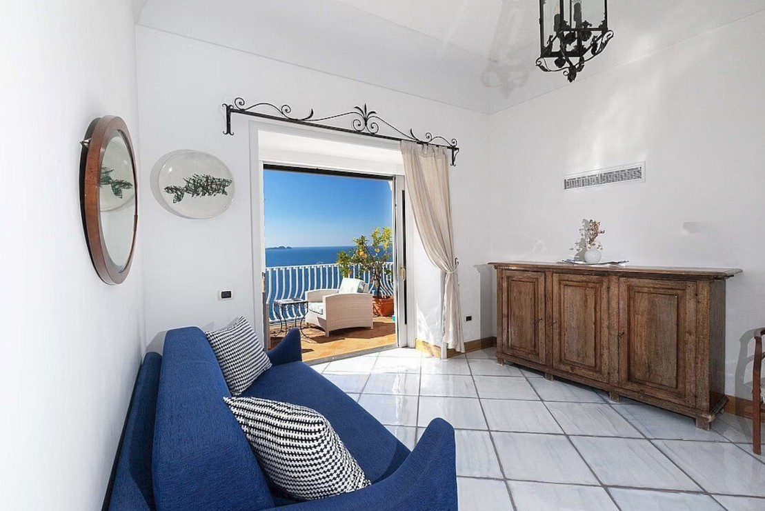 The living room is paved with handmade majolica tiles, in the characteristic style of the Amalfi Coast. The furnishings are elegant and bright, and include two sofas and two armchairs. The dining table can accommodate 12 guests. In this room you will find a large flat-screen satellite television (local channels) and a DVD player. From the living room you will be able to enter the first terrace with a view of the sea and of Positano through two double-glazed French doors. The room is equipped with an air conditioning/heating unit.