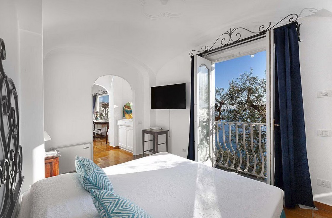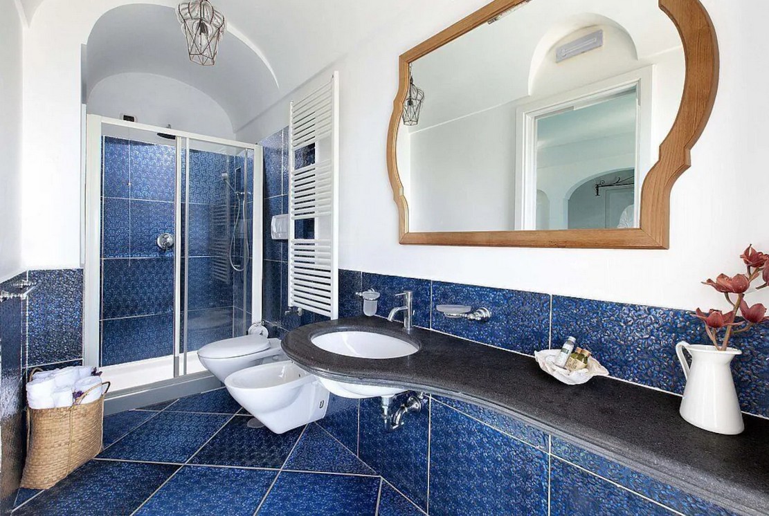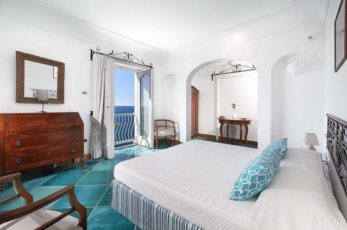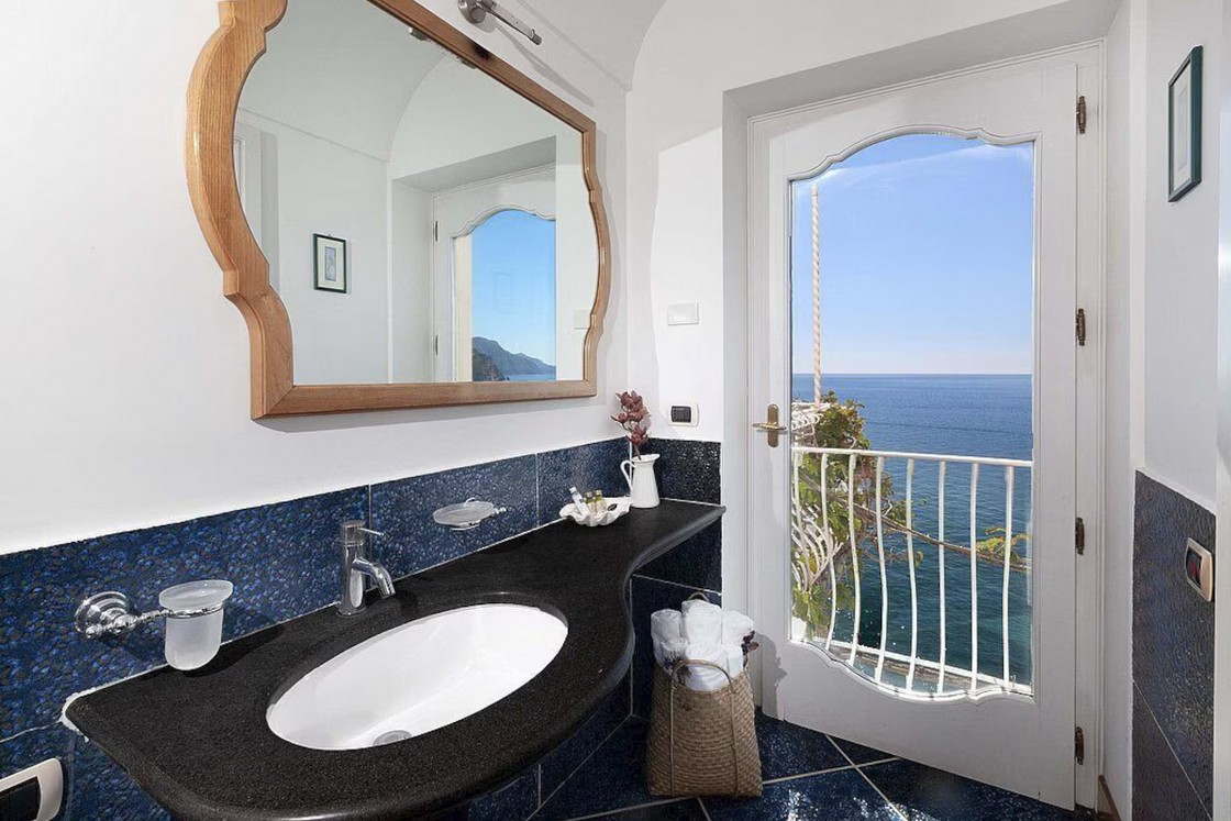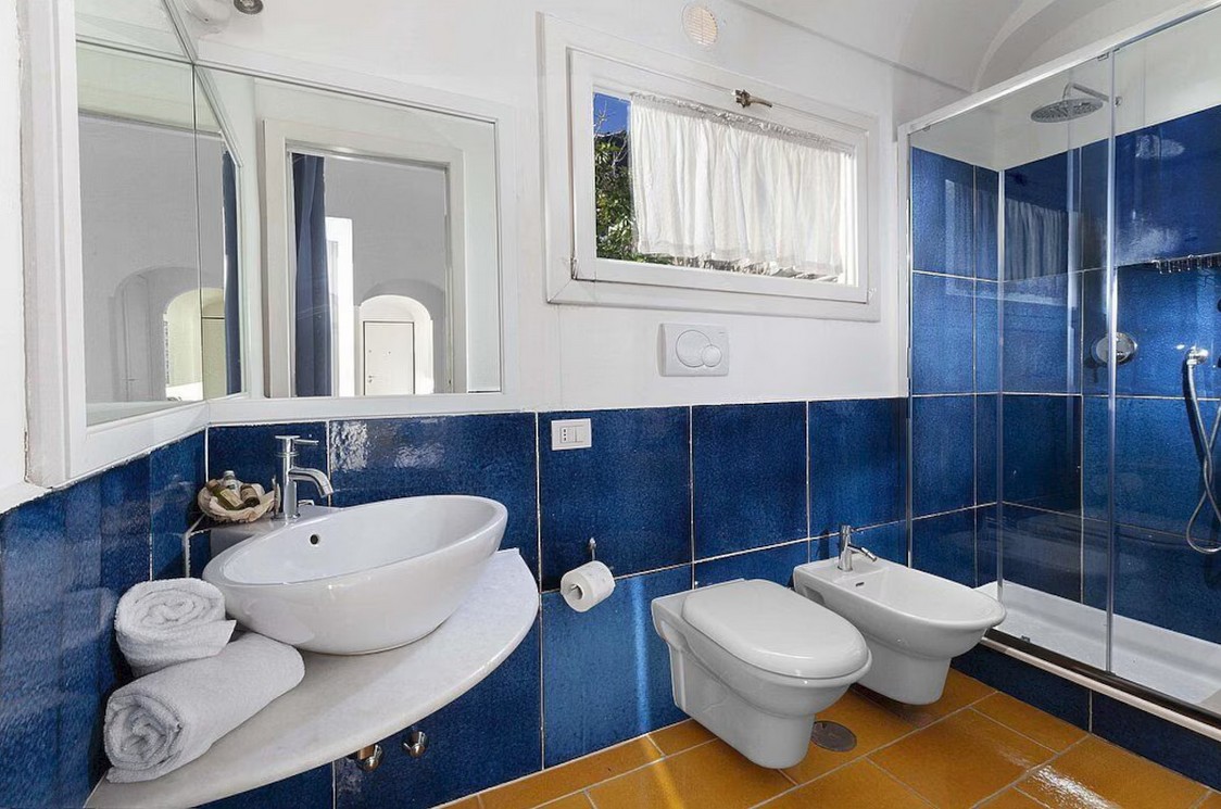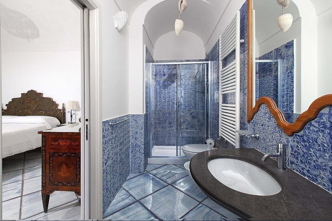 Bedroom/ensuite. You will be able to enter the first bedroom from the corridor. The floor is paved with lucid sky-blue majolica tiles. The furnishings are elegant and refined, and include some antique pieces. The room has a matrimonial bed (160 cm/63 inches, wider than a queen-size bed), that can be split into twins if requested (please contact our staff in advance to make arrangements). From the bedroom you will be able to enter the small balcony with a view of the sea and of Positano through a French door. The bedroom is equipped with an air conditioning/heating unit, and you will also find a safe. This bedroom has an en-suite bathroom, tiled with lucid handmade majolica tiles and equipped with a washbasin, a toilet, a large fully-enclosed shower and a hairdryer.