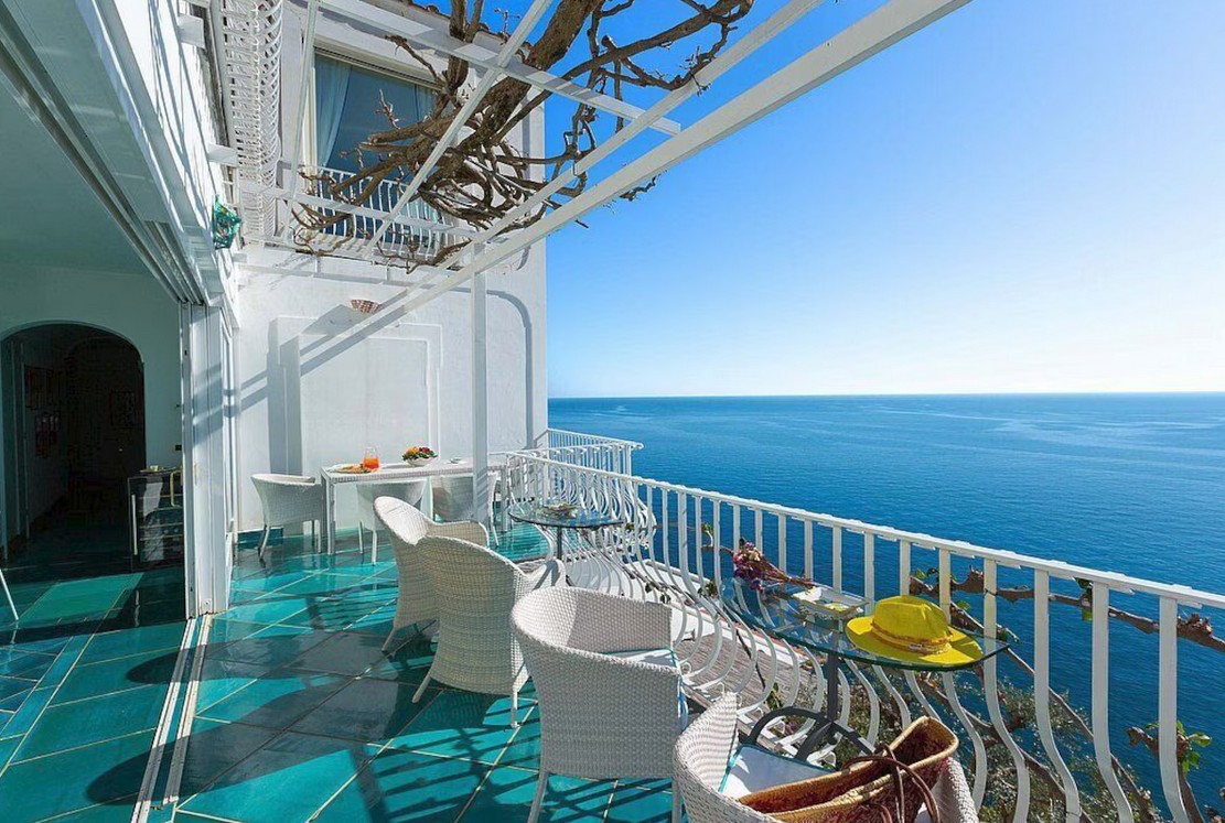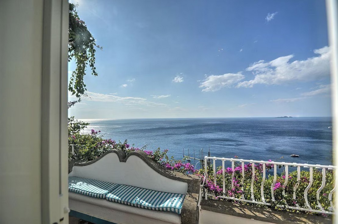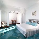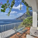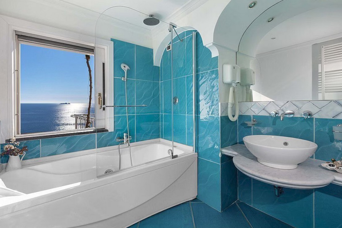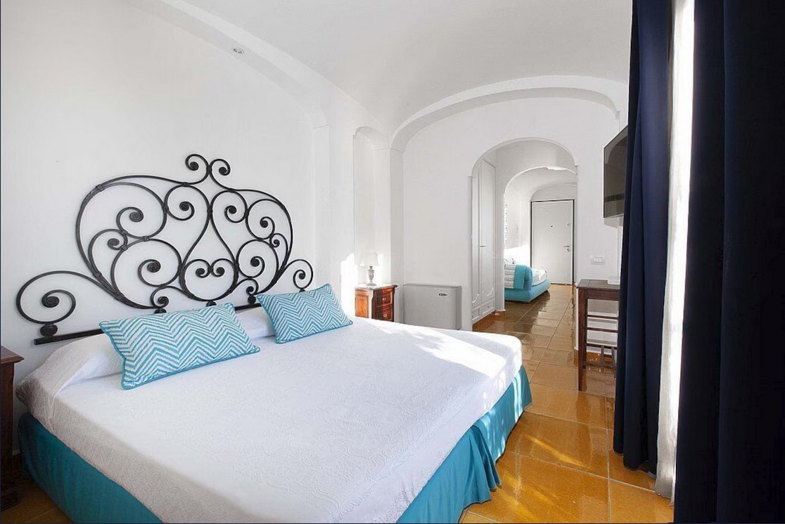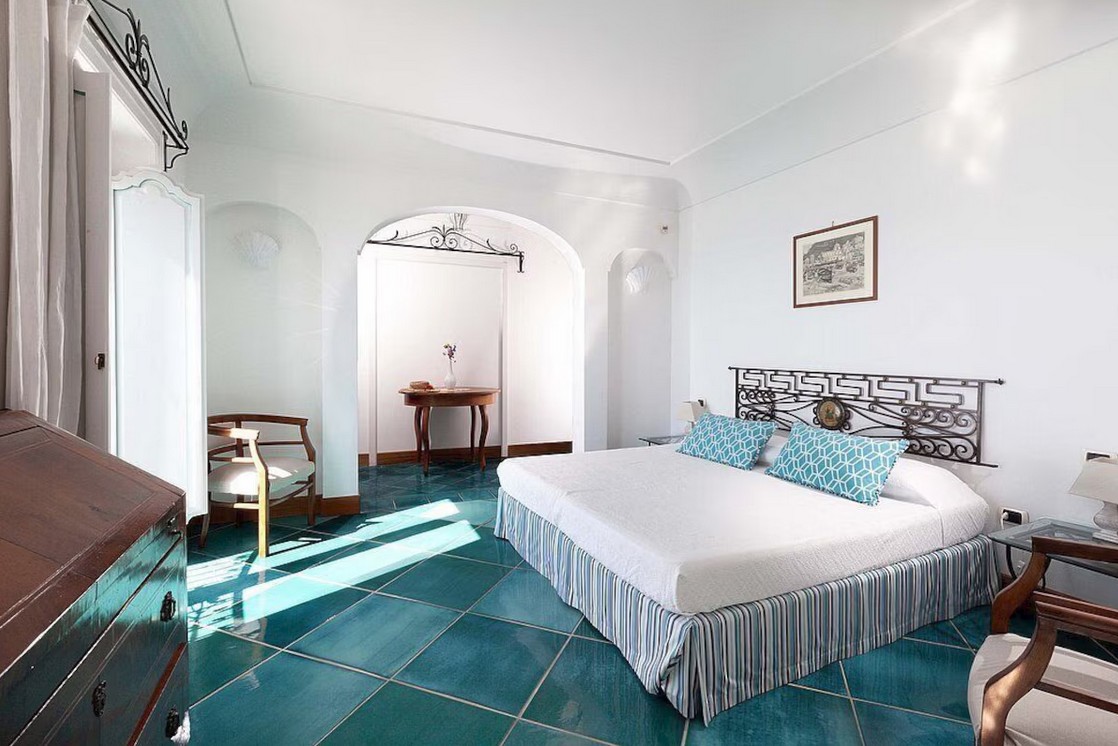 Bedroom/ensuite. You will be able to enter the first bedroom from the corridor. The floor is paved with lucid sky-blue majolica tiles. The furnishings are elegant and refined, and include some antique pieces. The room has a matrimonial bed (160 cm/63 inches, wider than a queen-size bed), that can be split into twins if requested (please contact our staff in advance to make arrangements). From the bedroom you will be able to enter the small balcony with a view of the sea and of Positano through a French door. The bedroom is equipped with an air conditioning/heating unit, and you will also find a safe. This bedroom has an en-suite bathroom, tiled with lucid handmade majolica tiles and equipped with a washbasin, a toilet, a large fully-enclosed shower and a hairdryer.