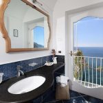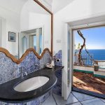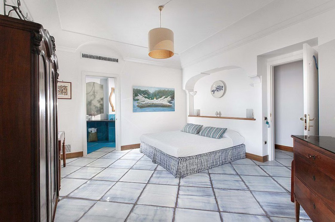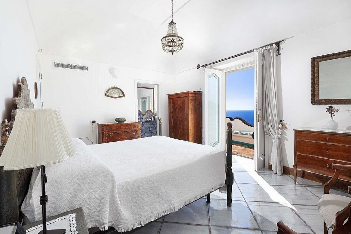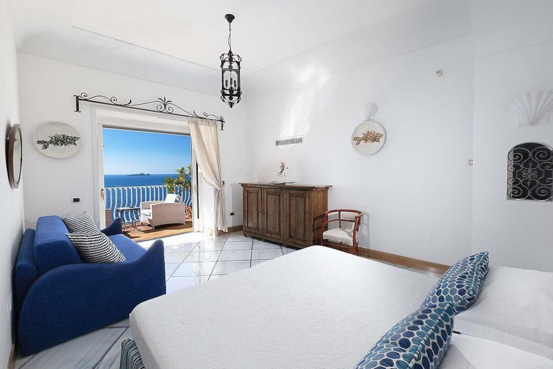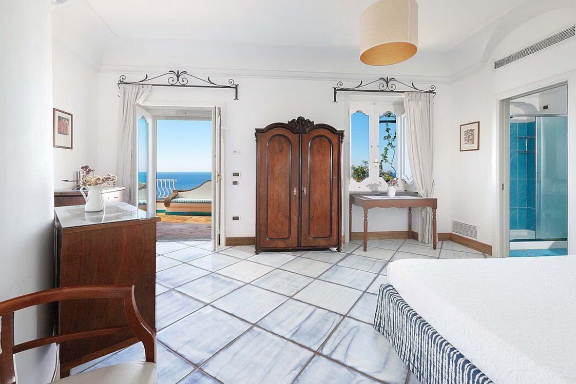 Bedroom/ensuite. You will be able to enter the fifth bedroom from the corridor. The furnishings are elegant and bright, and include some antique pieces. The room has a matrimonial bed (160 cm/63 inches, wider than a queen-size bed), that can be split into twins if requested (please contact our staff in advance to make arrangements). The furnishings include a sofa. From the bedroom you will be able to enter the second terrace with a view of the sea and of the coast of Amalfi through a French door. The bedroom is equipped with an air conditioning/heating unit, and you will also find a safe. This bedroom has an en-suite bathroom, tiled with lucid handmade majolica tiles and equipped with a washbasin, a toilet, a jacuzzi bathtub and a hairdryer.