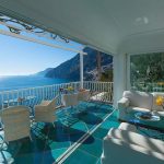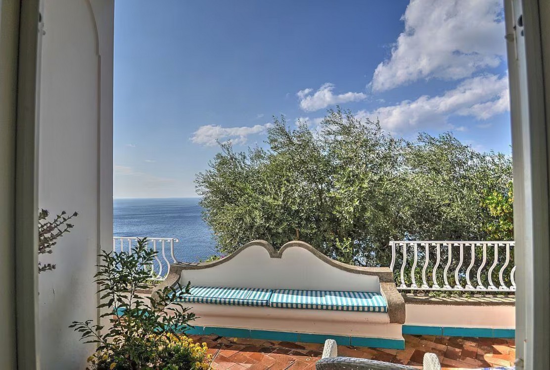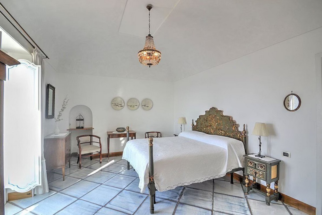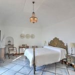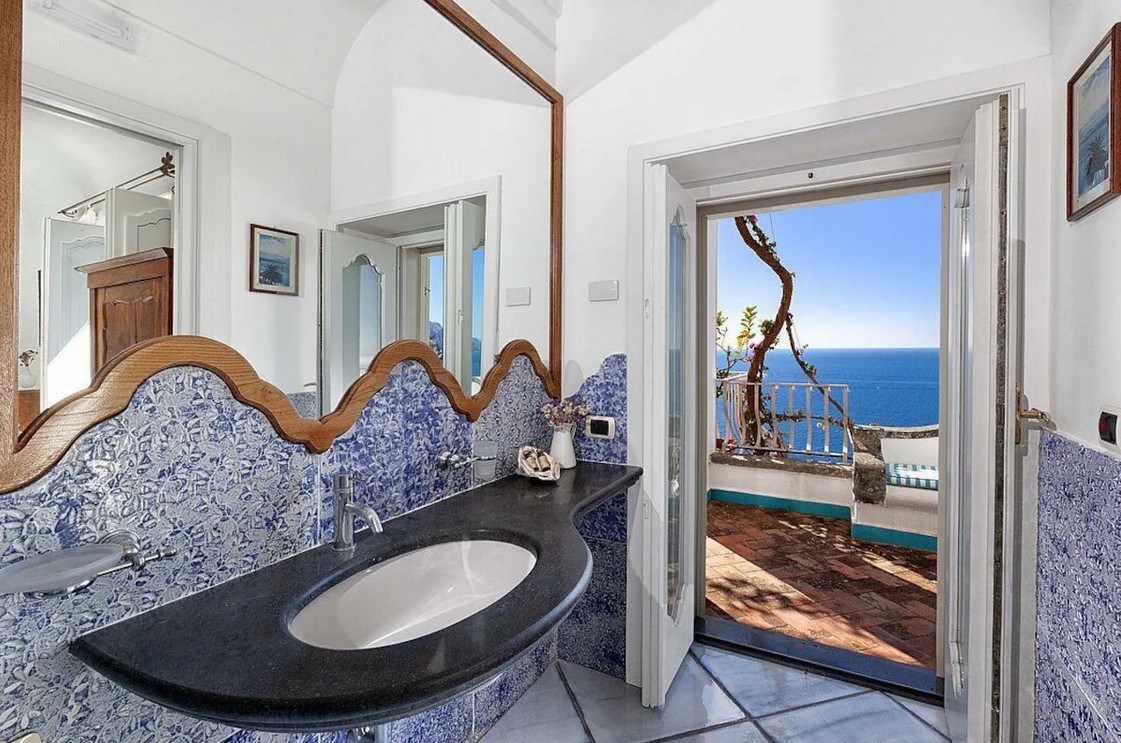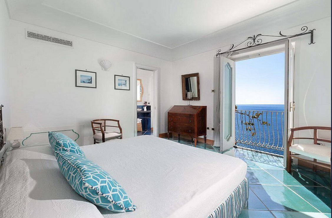 Bedroom/ensuite. You will be able to enter the fifth bedroom from the corridor. The furnishings are elegant and bright, and include some antique pieces. The room has a matrimonial bed (160 cm/63 inches, wider than a queen-size bed), that can be split into twins if requested (please contact our staff in advance to make arrangements). The furnishings include a sofa. From the bedroom you will be able to enter the second terrace with a view of the sea and of the coast of Amalfi through a French door. The bedroom is equipped with an air conditioning/heating unit, and you will also find a safe. This bedroom has an en-suite bathroom, tiled with lucid handmade majolica tiles and equipped with a washbasin, a toilet, a jacuzzi bathtub and a hairdryer.