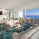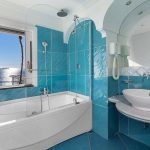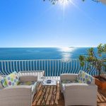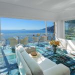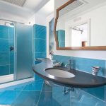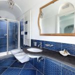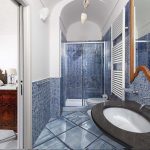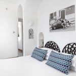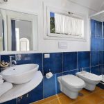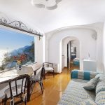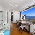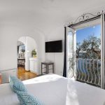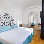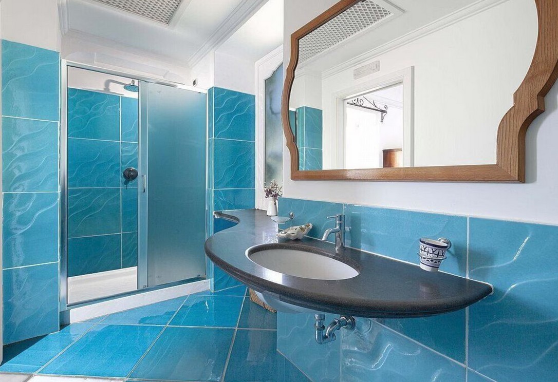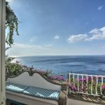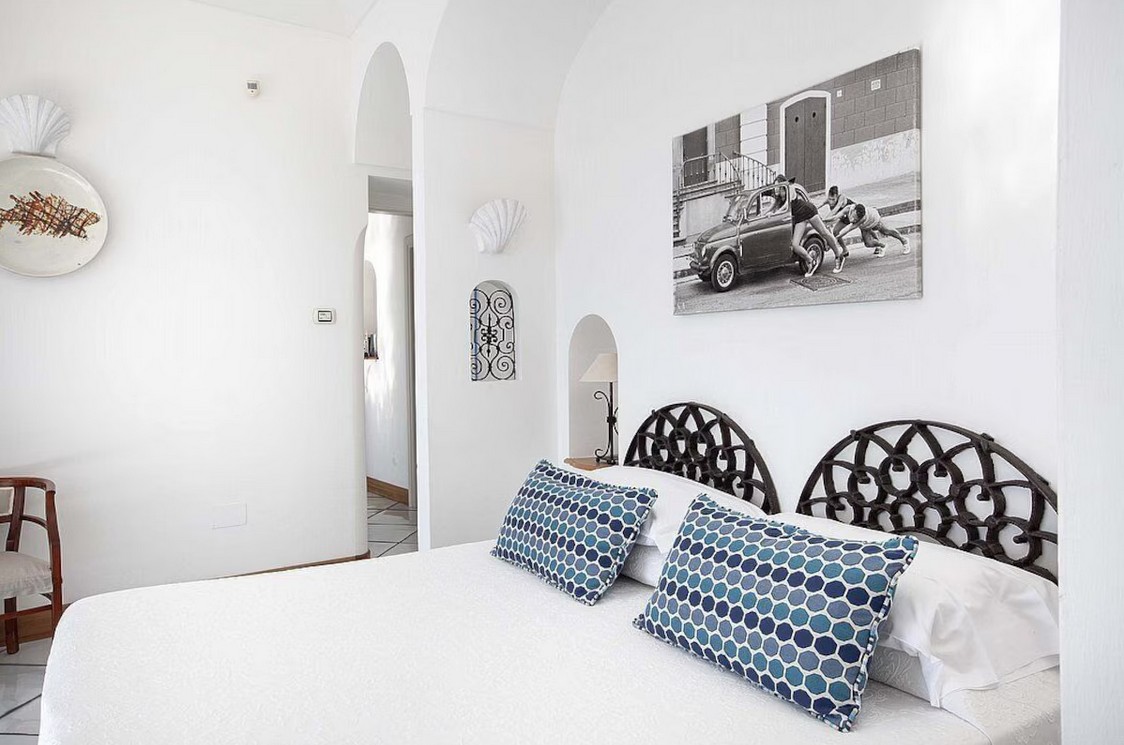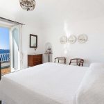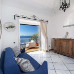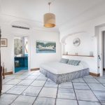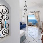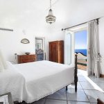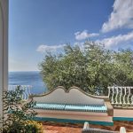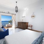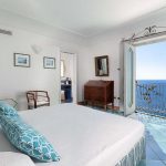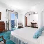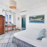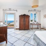 Bedroom/ensuite. You will be able to enter the second bedroom from the corridor. The floor is paved with lucid sky-blue majolica tiles. The furnishings are elegant and bright, and include some antique pieces. The room has a matrimonial bed (160 cm/63 inches, wider than a queen-size bed), that can be split into twins if requested (please contact our staff in advance to make arrangements). From the bedroom you will be able to enter a terrace with a view of the sea and of the coastline through a French door. The room has a window with a view of the sea and of the coastline, and it’s equipped with an air conditioning/heating unit, and you will also find a safe. This bedroom has an en-suite bathroom, spacious and equipped with a washbasin, a toilet, a large fully-enclosed shower and a hairdryer.