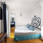 Bedroom/ensuite. You will be able to enter the fourth bedroom from the corridor. The furnishings are elegant and refined, and include some antique pieces. The room has a matrimonial bed (160 cm/63 inches, wider than a queen-size bed). From the bedroom you will be able to enter the second terrace through a French door. The bedroom is equipped with an air conditioning/heating unit, and you will also find a safe. This bedroom has an en-suite bathroom, tiled with lucid handmade majolica tiles and equipped with a washbasin, a toilet, a large fully-enclosed shower and a hairdryer.