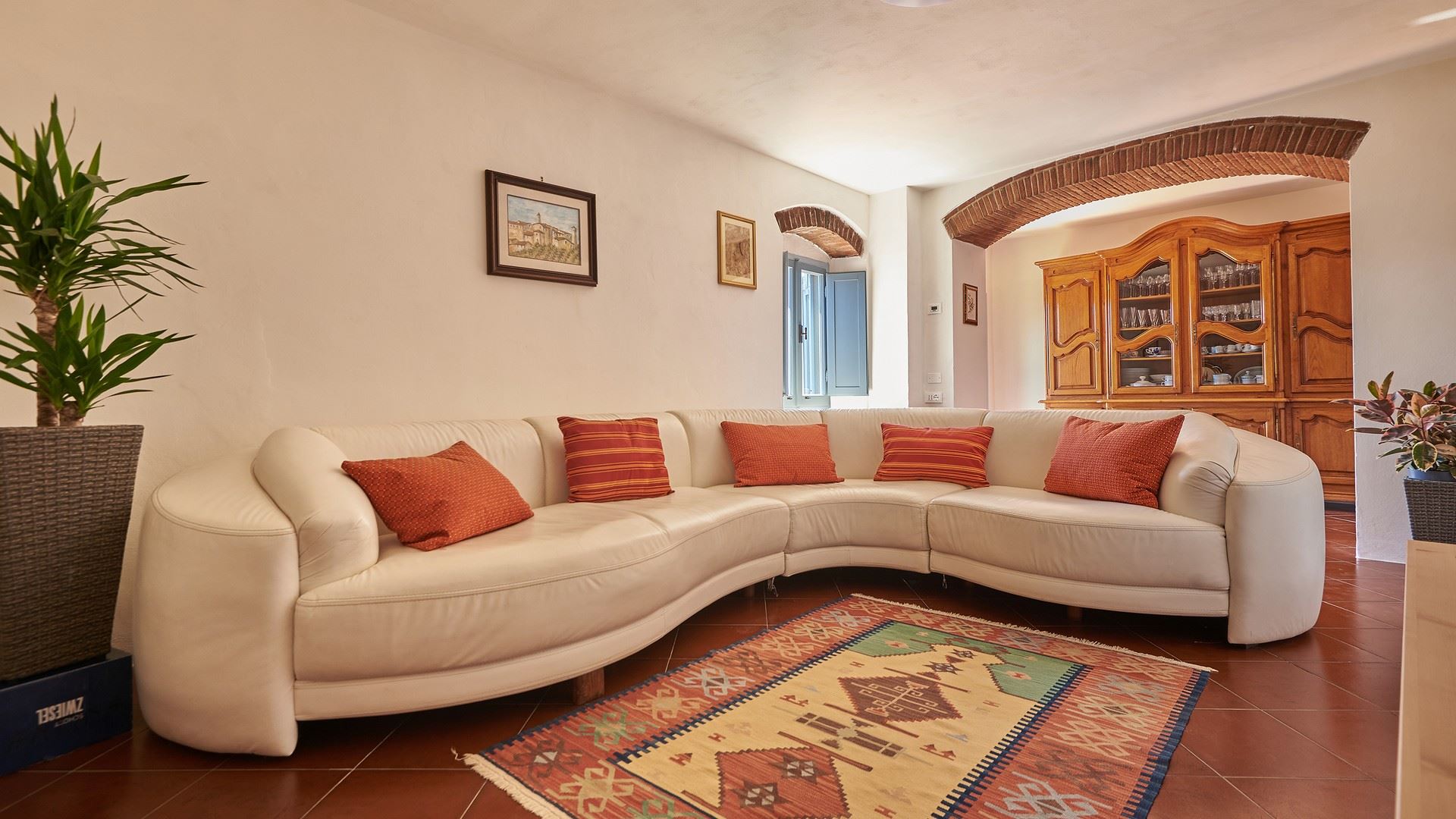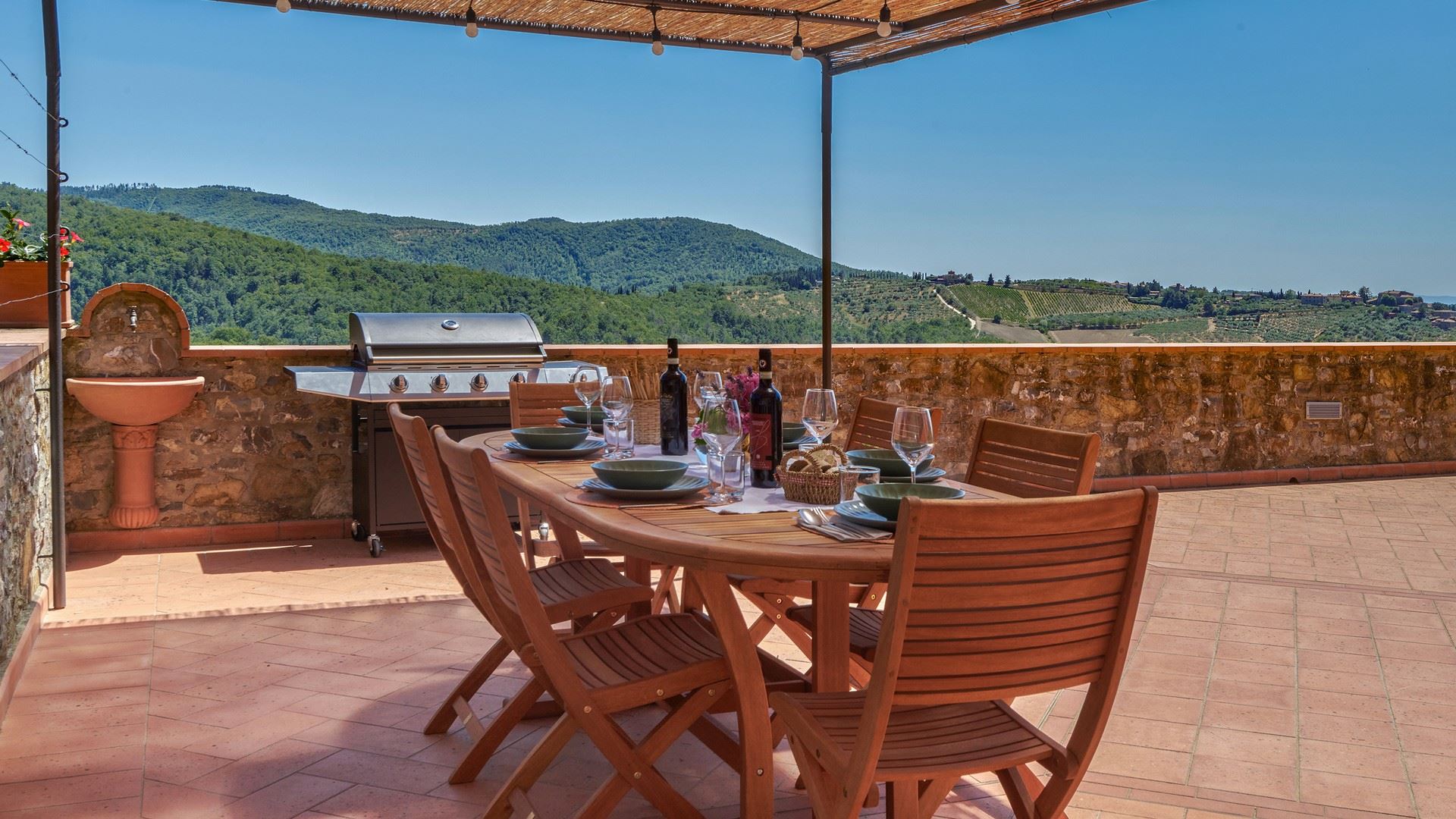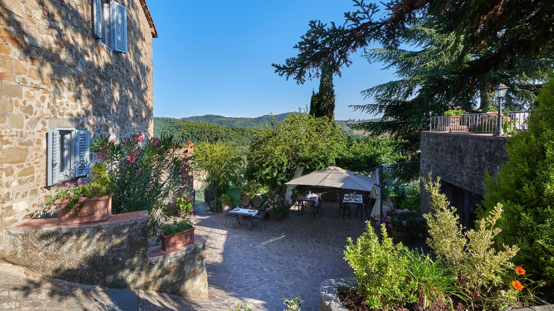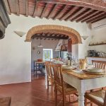 This stone-crafted villa boasts superb views and exceptional privacy, situated next to a working winery. Its three-tiered terraces are south-facing, ensuring sun-soaked days and breathtaking sunsets. The top terrace, conveniently located by the kitchen, features a charming al fresco dining area perfect for leisurely meals under the Tuscan sky. The middle terrace invites friendly competition with its dedicated bowling green, while the lower terrace unfolds onto a private pool and meticulously maintained gardens, offering a serene retreat for relaxation.