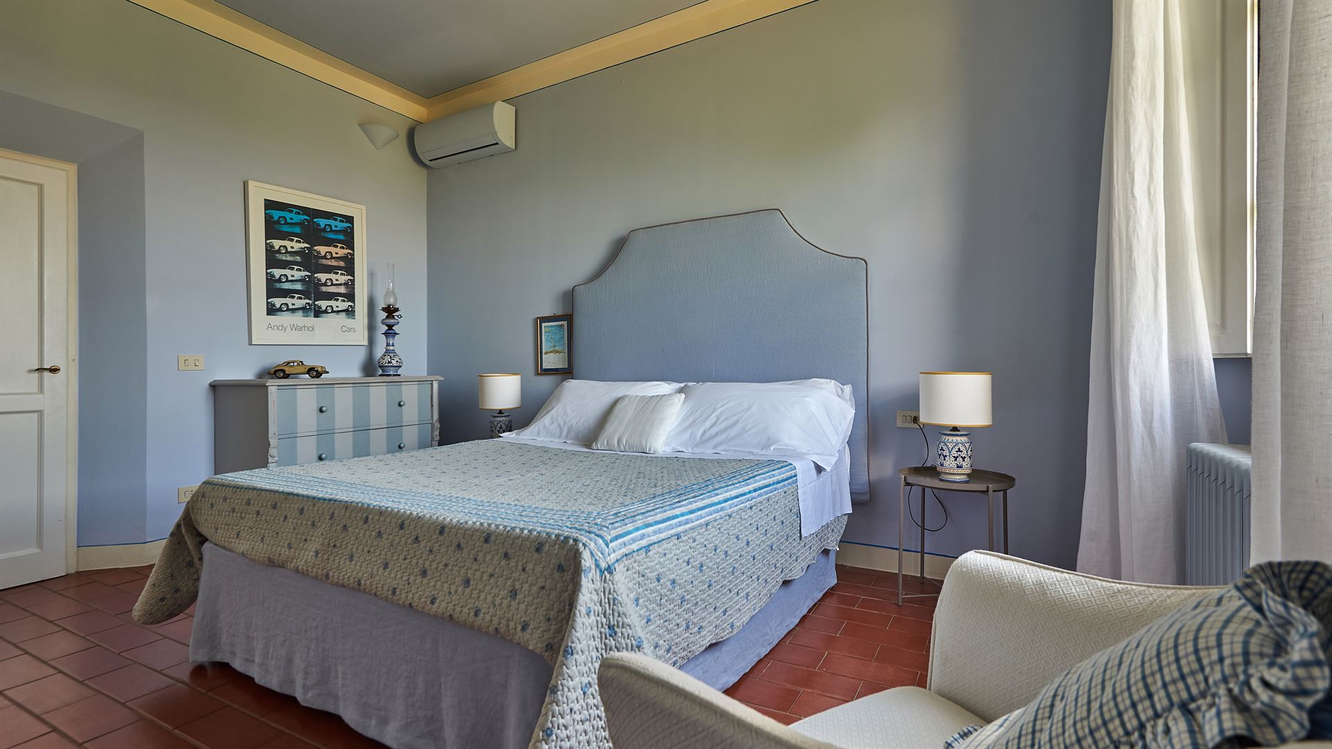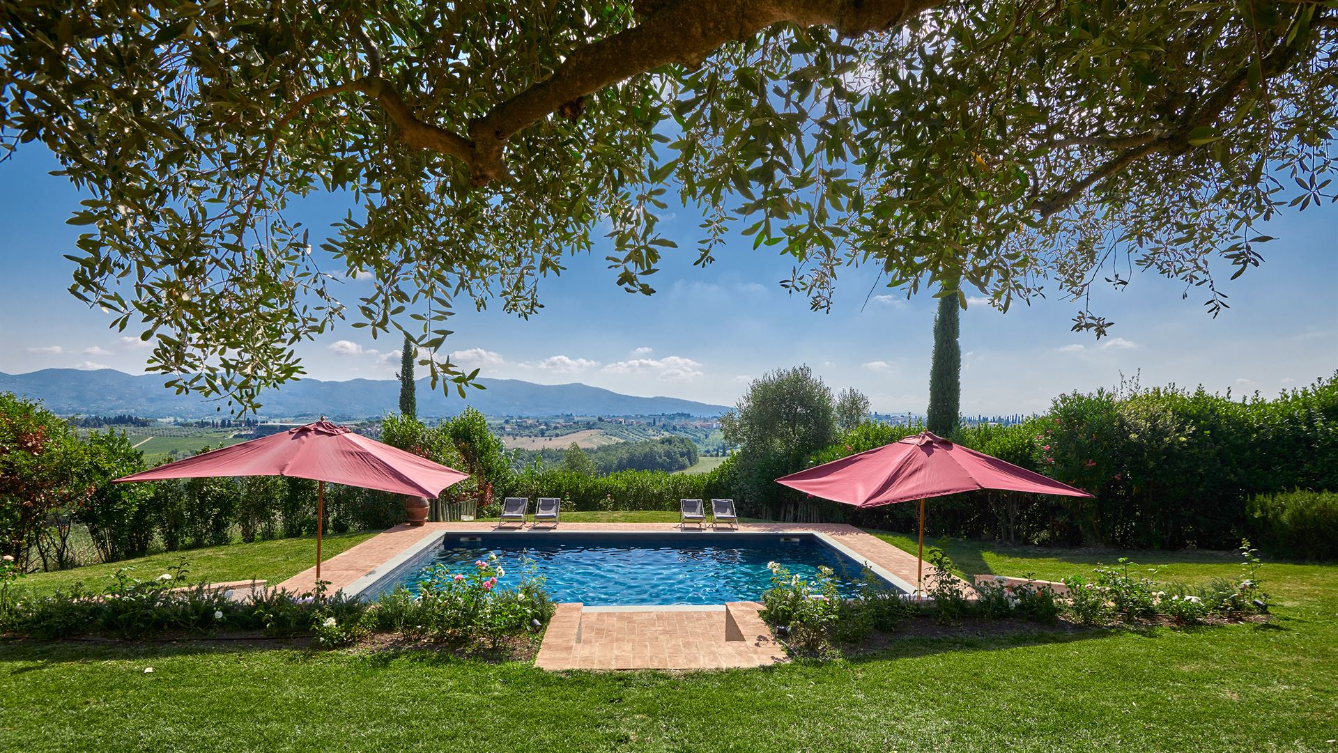 There’s a private pool with sweeping views of the Tuscan countryside, a panorama that can also be enjoyed from the vast tree-lined lawns and two vine-covered terraces.