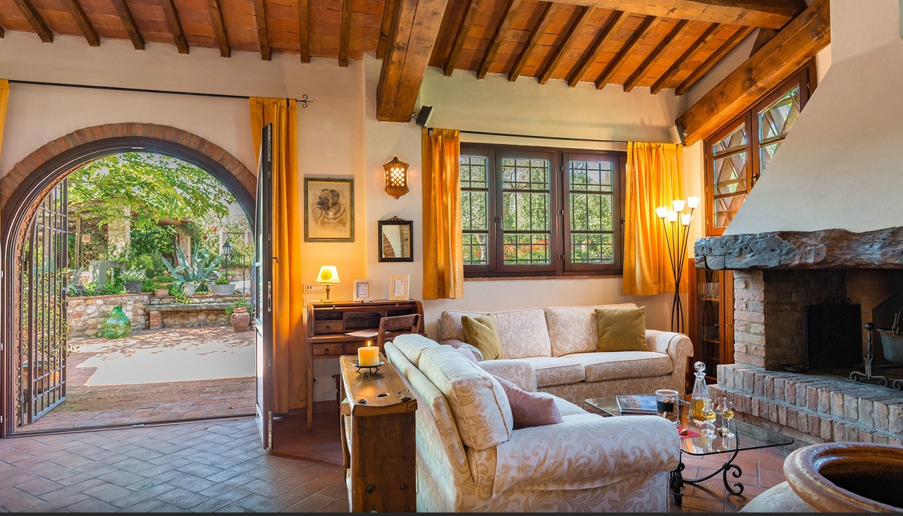 The Villa is surrounded by a garden of 3000 s m, completely fenced-in and bordered along the perimeter by lush hedges ensuring privacy without depriving you of the view over the beautiful hilly landscape on the south side of the property. After the automatic entrance gate, a gravel drive decorated with roses leads to the parking area located close to the entrance of the villa. From here you will be welcomed by a triumphant garden full of colour: beds of flowers, Mediterranean herb bushes, cypresses and centuries-old olive trees from Spain and Apulia. To complete the whole, a beautiful lawn with an attractive, fully-equipped swimming pool. Next to the pool there is the children area. On the south side of the villa is a shady and spacious portico, communicating with the kitchen and equipped with teak furniture and stone barbecue for cosy outdoor dining.