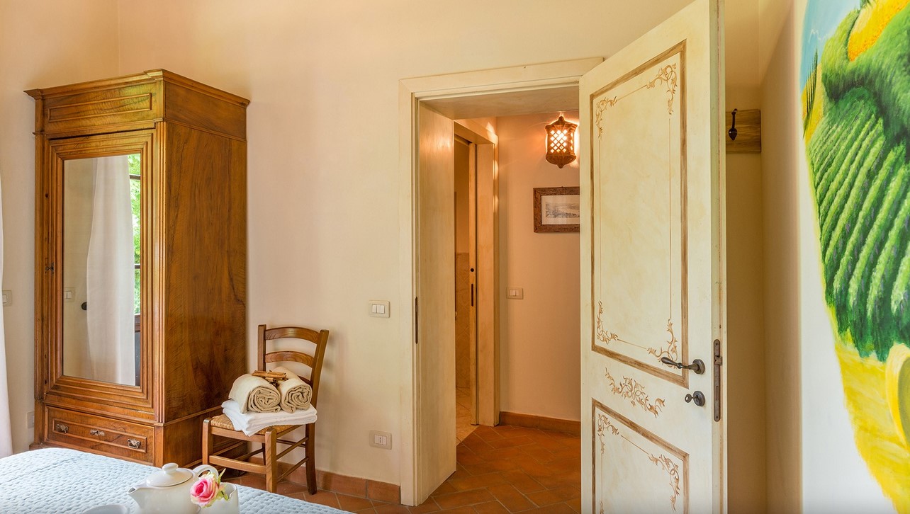 The swimming pool, surrounded by greenery, provides guests with a unique view of the rolling hills typical of the area. Set on one side of the house, and just a few metres away, it is reached across the lawn; rectangular with Roman steps in a recessed corner, it has a travertine edge and blue Sardinia PVC lining. It measures 5 x10 m with a constant depth of 1.40 m and has salt purification, internal lighting and non-invasive external fencing. Around the pool is the terracotta-paved sunbathing area, equipped with gazebo, sunbeds, umbrellas and a table with chairs.The pool is open from the last Saturday of April until the first Saturday of October.