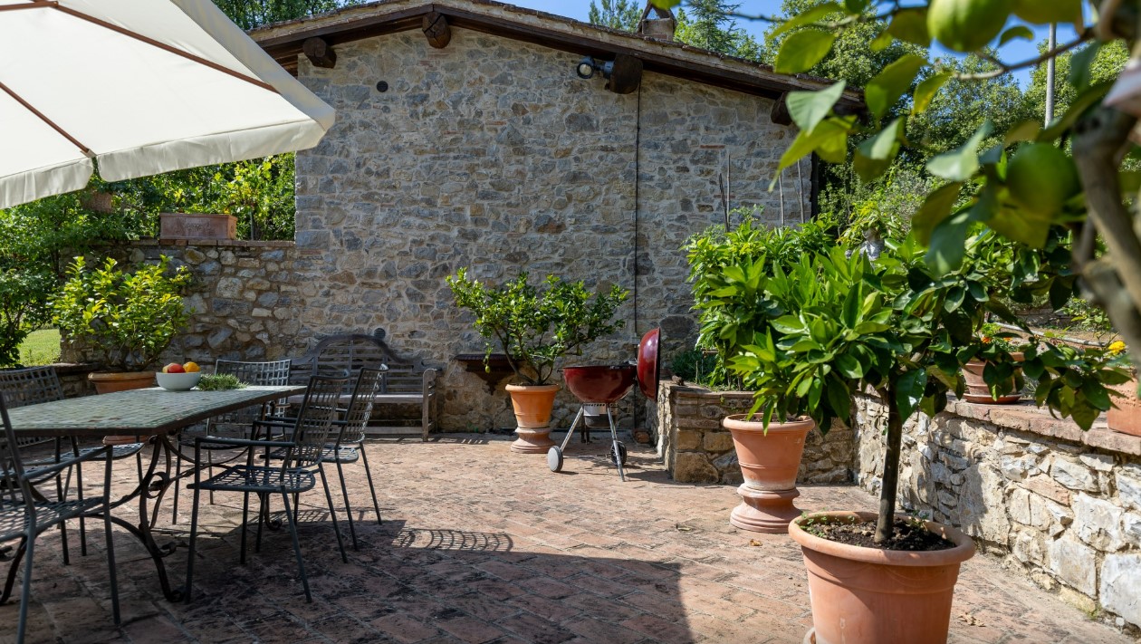 The infinity pool is located on the same level as the houses and is reached across approximately 40 m of lawn. Rectangular and measuring 12 x 6 m with a depth that varies from 1.50 to 2.50 m, it is lined in light blue PVC and has salt purification, two internal spotlights and an aluminium ladder for access to the water. The pool has a stone border and is surrounded by a solarium paved in Chianti stone and equipped with teak beds, deck chairs and umbrellas. There is a solar shower available. The pool is available from the last Saturday of April until the first Saturday of October.