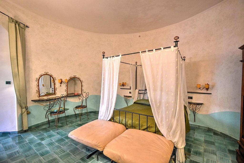 The second living room is paved with lucid green tiles. The furnishings are elegant and welcoming, and include some antique pieces. The furnishings include three sofas and a desk. From the living room you will be able to enter the fourth terrace with a view of the sea and of the coast of Amalfi through a French door. The room has a large panoramic window with a partial view of the sea. It is equipped with an air conditioning/heating unit.