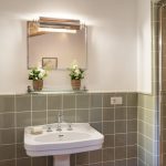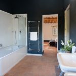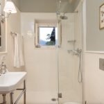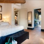To the left of the main entrance are the stairs leading up to the first floor, occupied entirely by the sleeping area. To the left of the stairs is the first twin bedroom with joinable beds and a bathroom with shower and skylight. The bedroom leads to the raised area of the garden. Opposite the stairs is a double bedroom with four-poster bed with access to the garden and ensuite bathroom with shower. To the right of the stairs is the third double bedroom with ensuite bathroom with double basin and tub with tassel for shower. Each bedroom, on both the ground and the first floor, is equipped with a double USB port at the headboard of the bed.