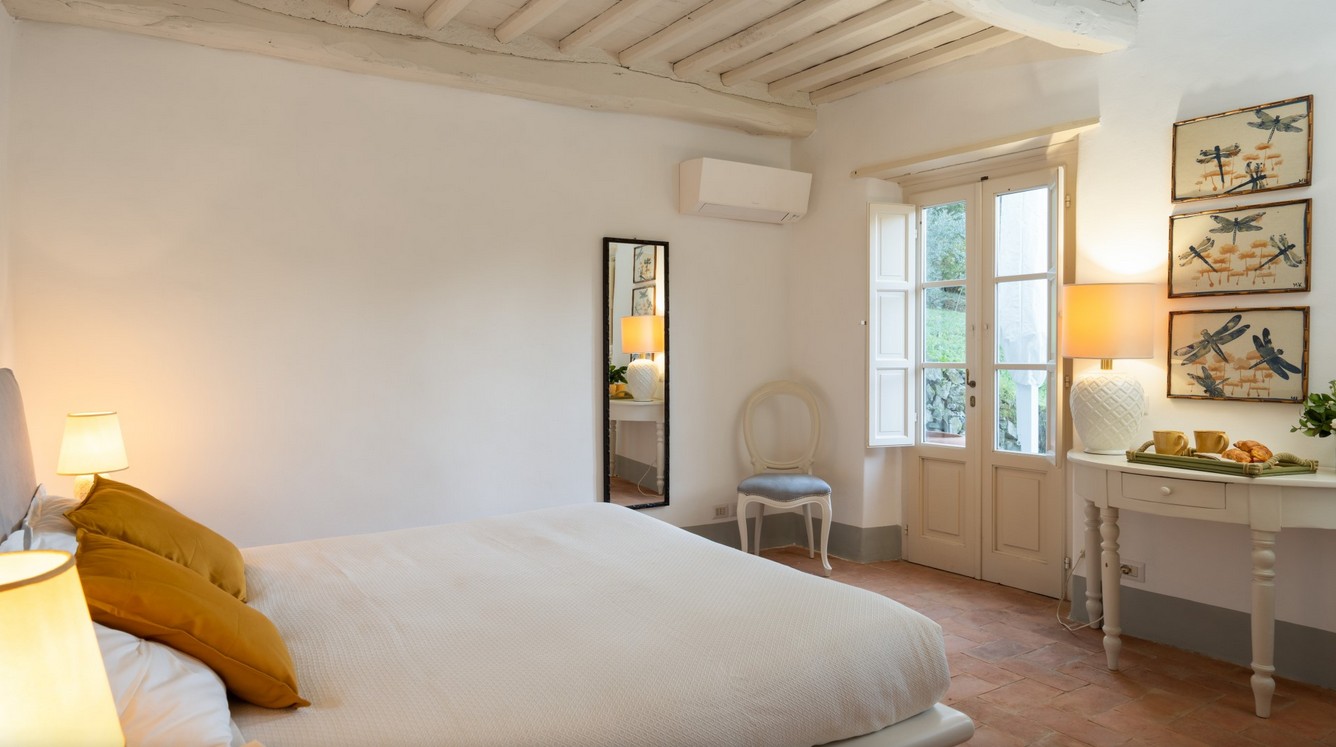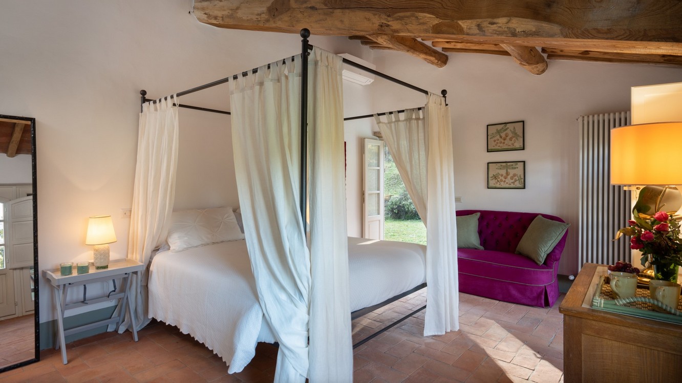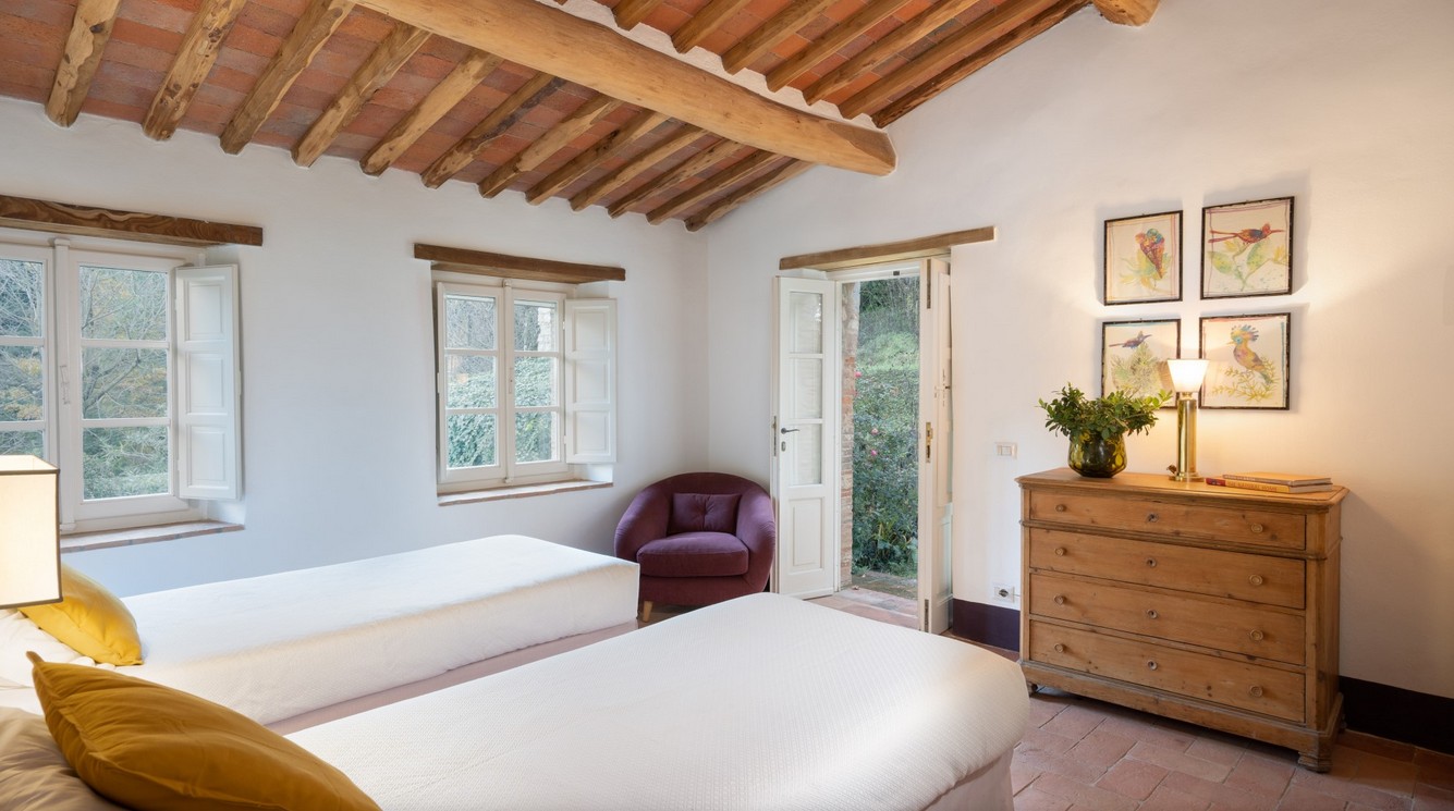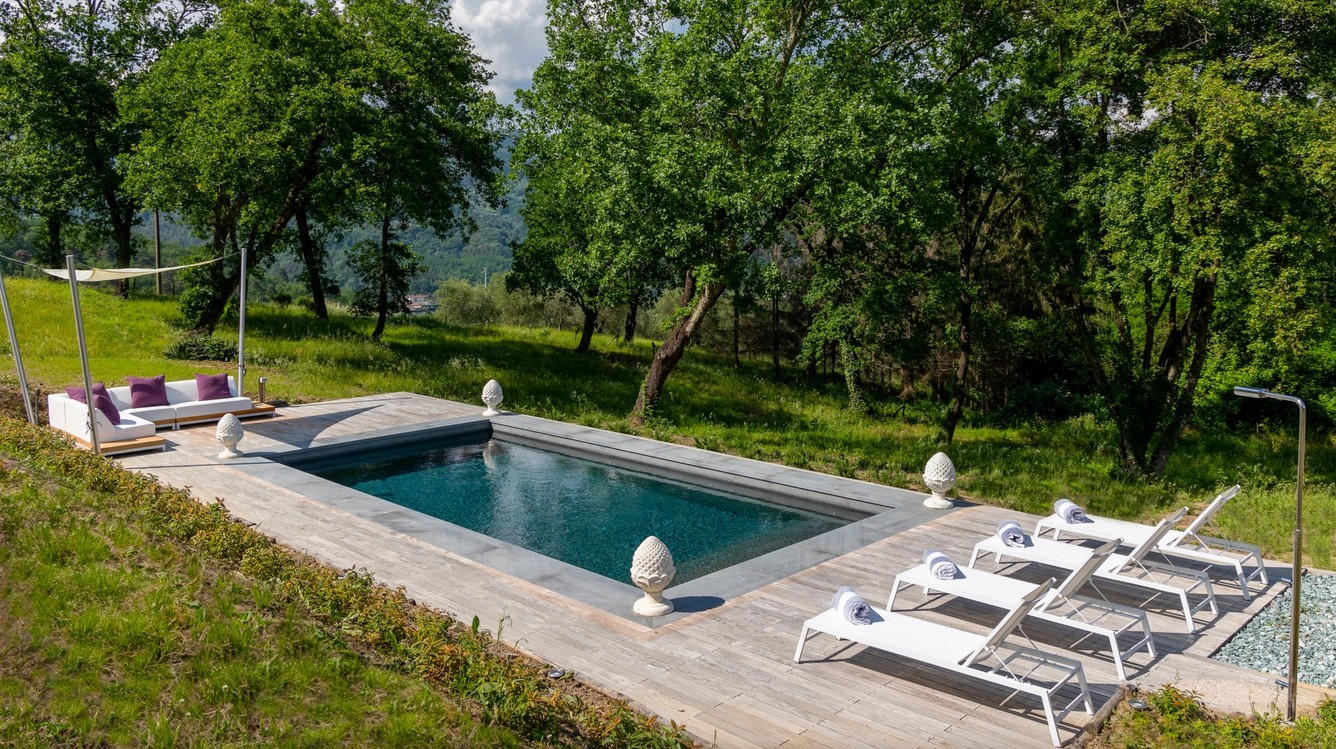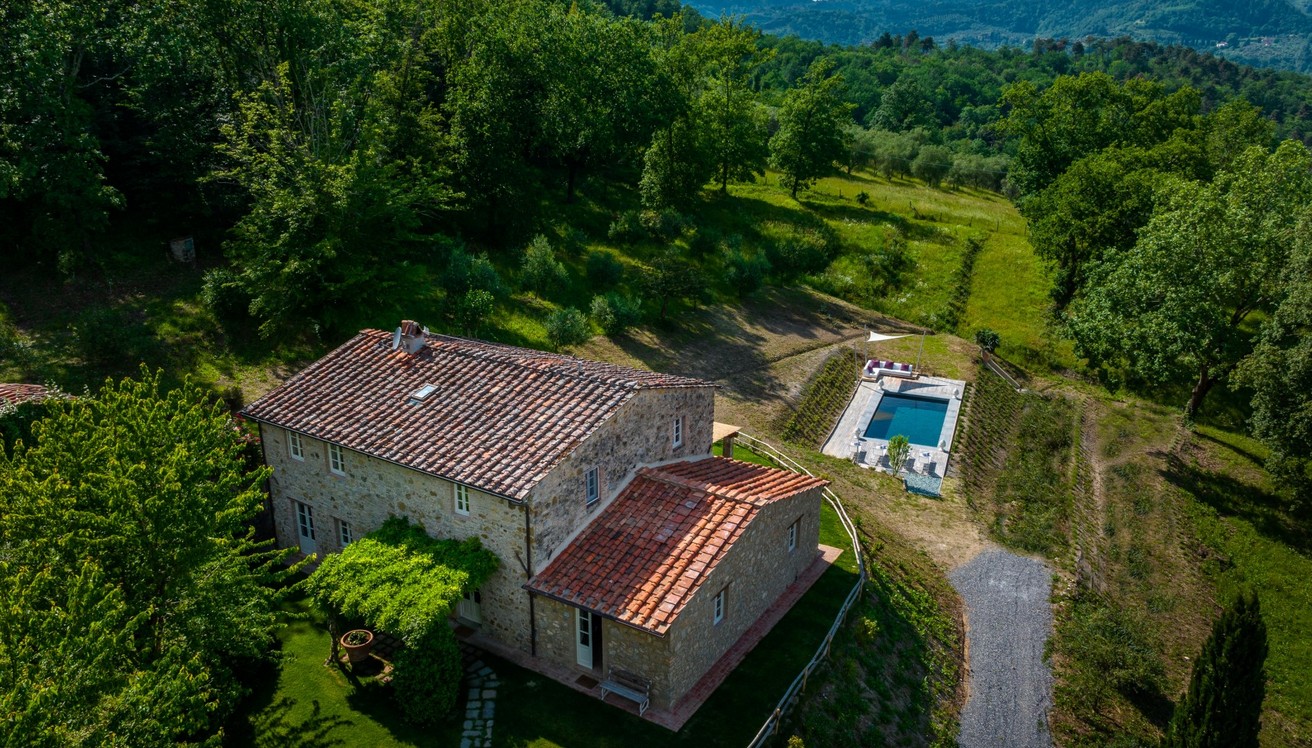 Just a short distance from the beautiful city of Lucca, is immersed in the green of a large wood that surrounds the entire property. The villa stands in the small borgo of Monsagrati, where you can admire the old Romanesque church of San Giovanni Battista, built in 1102. The villa has two floors and is an old 18th century country house recently restructured by the owners into a modern Tuscan rustic home, where the characteristic elements of this style are the terracotta floors and the ceiling with exposed wooden beams. The villa is composed of 4 bedrooms with private bathroom and air conditioning (one of the double bedrooms on the first floor also has a fan), a cosy dining room and a modern, well-equipped kitchen, both leading to the external living area, and a living room with TV and fireplace. In the garden is a living area with dining table and the swimming pool. Completing the property is a small annex with the laundry area. Then there is the large park where you can relax and enjoy the quiet of the place or play on the mini volleyball court at your disposal. Surrounding the property is a large wooded area with many paths for walking or hiking.