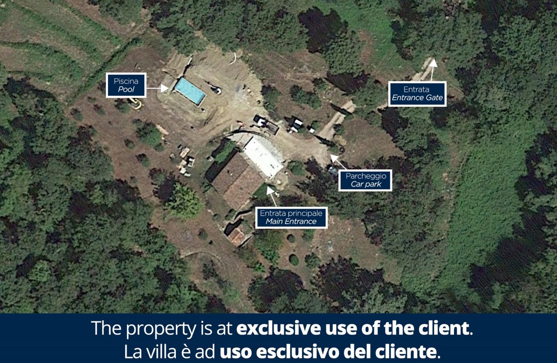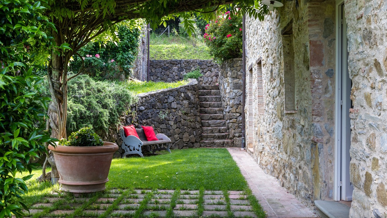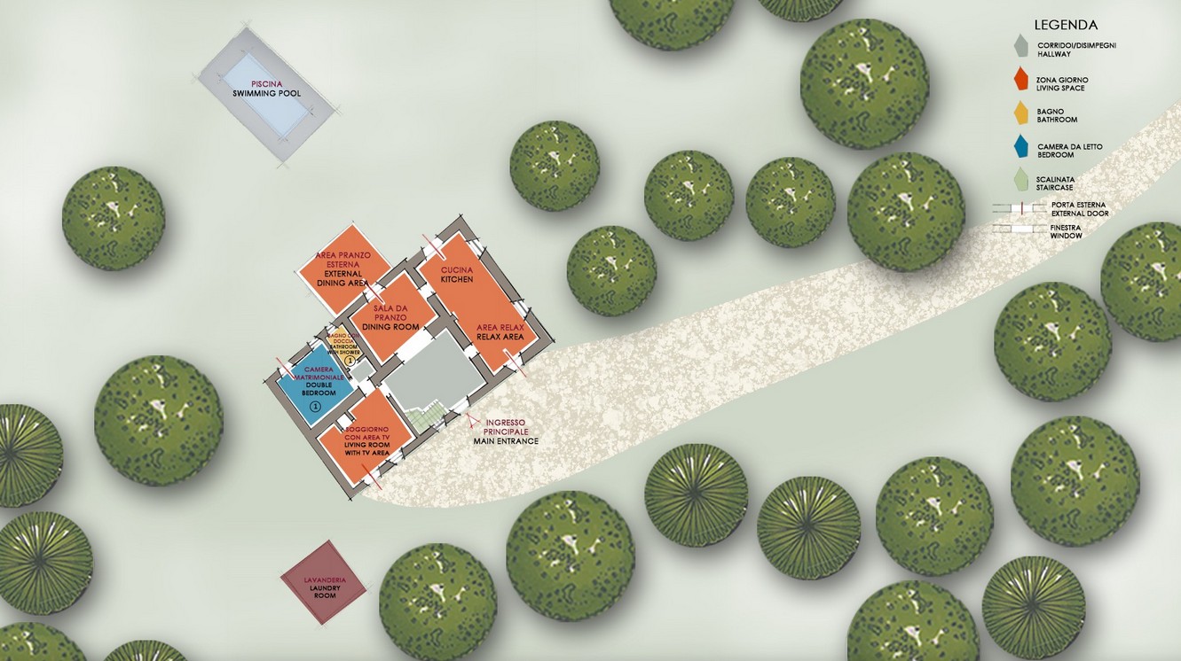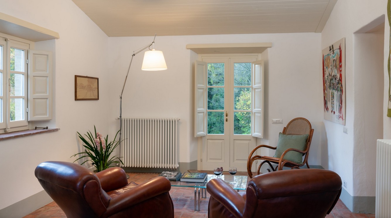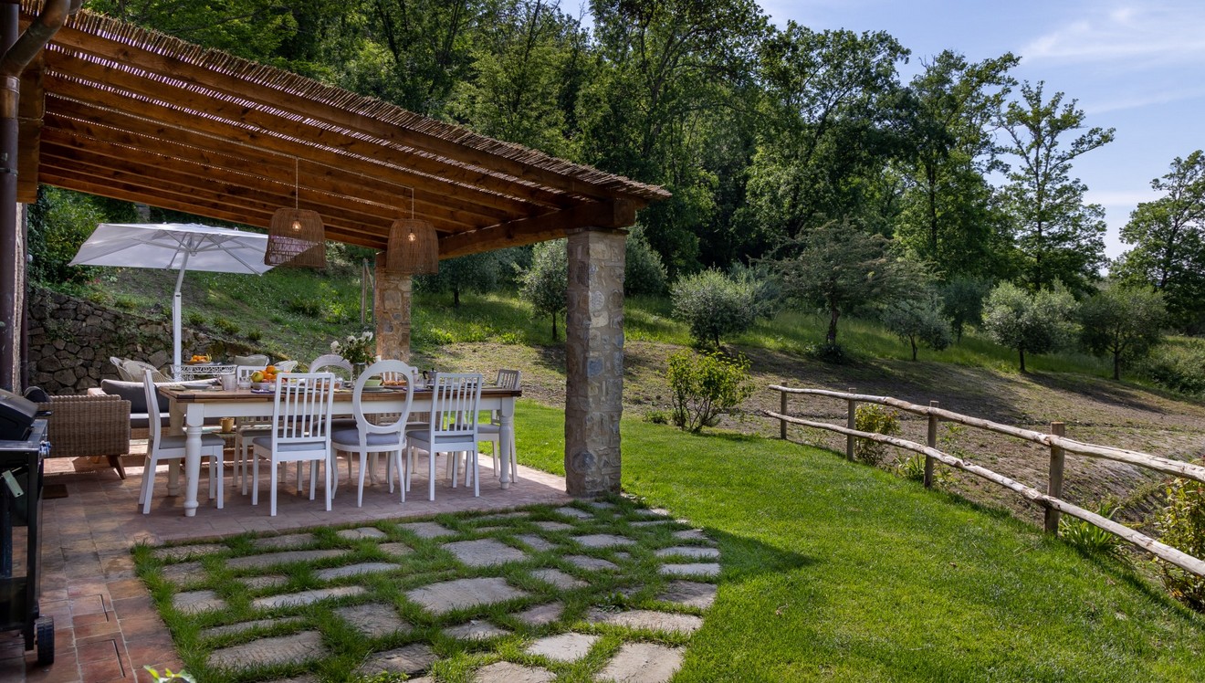 The huge park surrounding the villa extends over 2,8 hectares of terrain, completely fenced and accessible. As soon as you are past the first gate leading to the property, you are immediately immersed in a vast wooded area, which accompanies you along the entire driveway to the villa. The woods are full of oaks, junipers, ferns and cyclamen which can also be seen while walking around the villa. Once you get to the second access gate, you find yourself in the peaceful garden around the villa, with varied vegetation and flowering plants, such as roses and gardenias, which lend a beautiful touch of colour to the surrounding greenery. Welcoming you to the villa is a beautiful wisteria-covered pergola located just above the main entrance. In the park are many little corners that can be used in different ways: a beautiful nymphaeum created in an antique tub that receives water from the adjacent spring and a gym/yoga area, next to the woods about 50 m from the house, or the lovely external lounge area under a veranda where you can chat or lose yourself in a book. You can also enjoy excellent outdoor meals in the cosy dining area at the living room exit where, in addition to the excellent food, you will also enjoy the coolness of summer evenings. The three bedrooms with direct access to the garden have at their disposal a relaxation area with umbrellas, tables and deck chairs, where you can enjoy the peace and quiet of the property. The park is completed by an orchard with assorted seasonal fruit, such as apples, cherries, apricots and plums, and an area with aromatic herbs available to guests. In the park is also a small annex with the laundry room which is reached up a few stone steps. The parking area is located on the left at the end of the driveway.