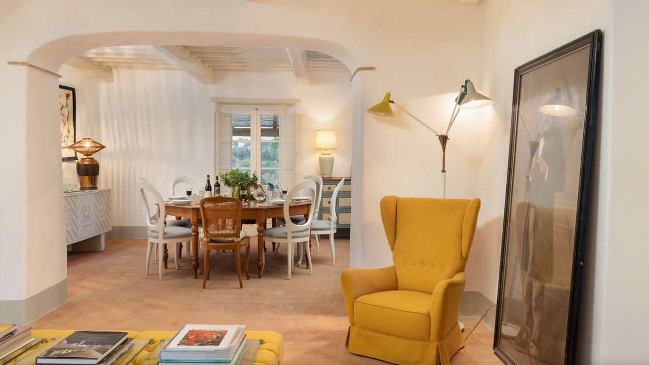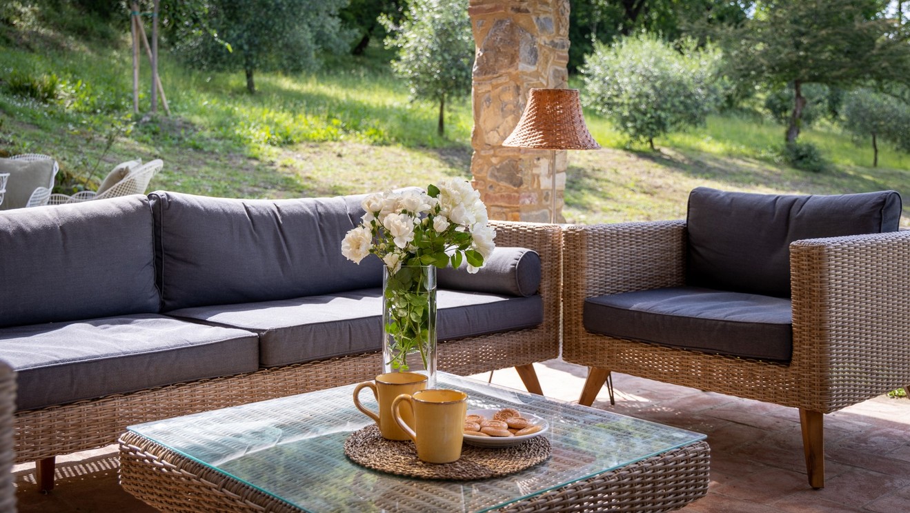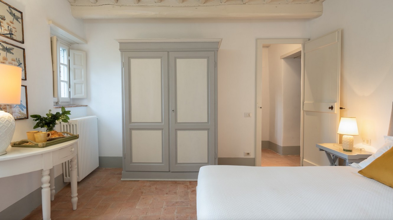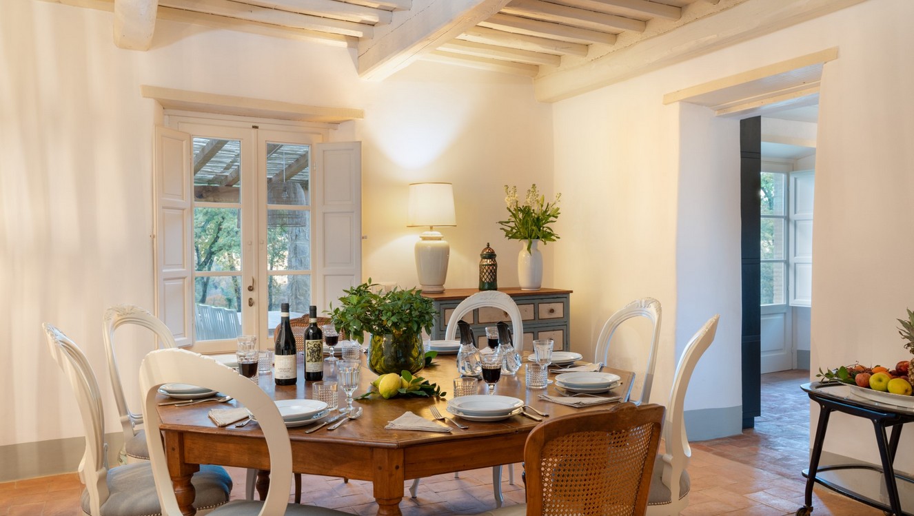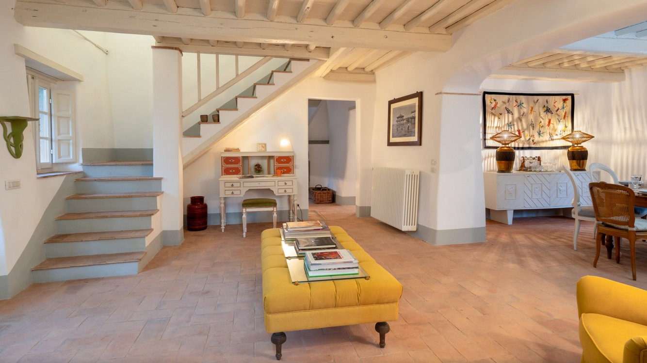 The huge park surrounding the villa extends over 2,8 hectares of terrain, completely fenced and accessible. As soon as you are past the first gate leading to the property, you are immediately immersed in a vast wooded area, which accompanies you along the entire driveway to the villa. The woods are full of oaks, junipers, ferns and cyclamen which can also be seen while walking around the villa. Once you get to the second access gate, you find yourself in the peaceful garden around the villa, with varied vegetation and flowering plants, such as roses and gardenias, which lend a beautiful touch of colour to the surrounding greenery. Welcoming you to the villa is a beautiful wisteria-covered pergola located just above the main entrance. In the park are many little corners that can be used in different ways: a beautiful nymphaeum created in an antique tub that receives water from the adjacent spring and a gym/yoga area, next to the woods about 50 m from the house, or the lovely external lounge area under a veranda where you can chat or lose yourself in a book. You can also enjoy excellent outdoor meals in the cosy dining area at the living room exit where, in addition to the excellent food, you will also enjoy the coolness of summer evenings. The three bedrooms with direct access to the garden have at their disposal a relaxation area with umbrellas, tables and deck chairs, where you can enjoy the peace and quiet of the property. The park is completed by an orchard with assorted seasonal fruit, such as apples, cherries, apricots and plums, and an area with aromatic herbs available to guests. In the park is also a small annex with the laundry room which is reached up a few stone steps. The parking area is located on the left at the end of the driveway.
