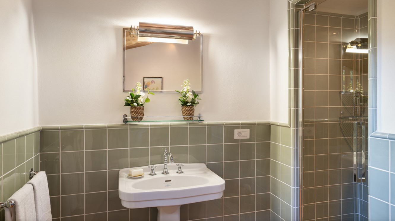 The swimming pool is located behind the property, on a lower terrace adjacent to the villa and can be reached in just a few steps along a downhill path. Rectangular and measuring 4 x 8 m with a constant depth of 1.50 m, the pool is lined in grey granito and bordered by teak wood flooring. It has chlorine purification, 3 internal spotlights and submerged steps for access to the water. The surrounding sunbathing area is equipped with sunbeds, a cold-water shower and an area with sofas and awning. The swimming pool is open from the last Saturday in April until the first Saturday in October.