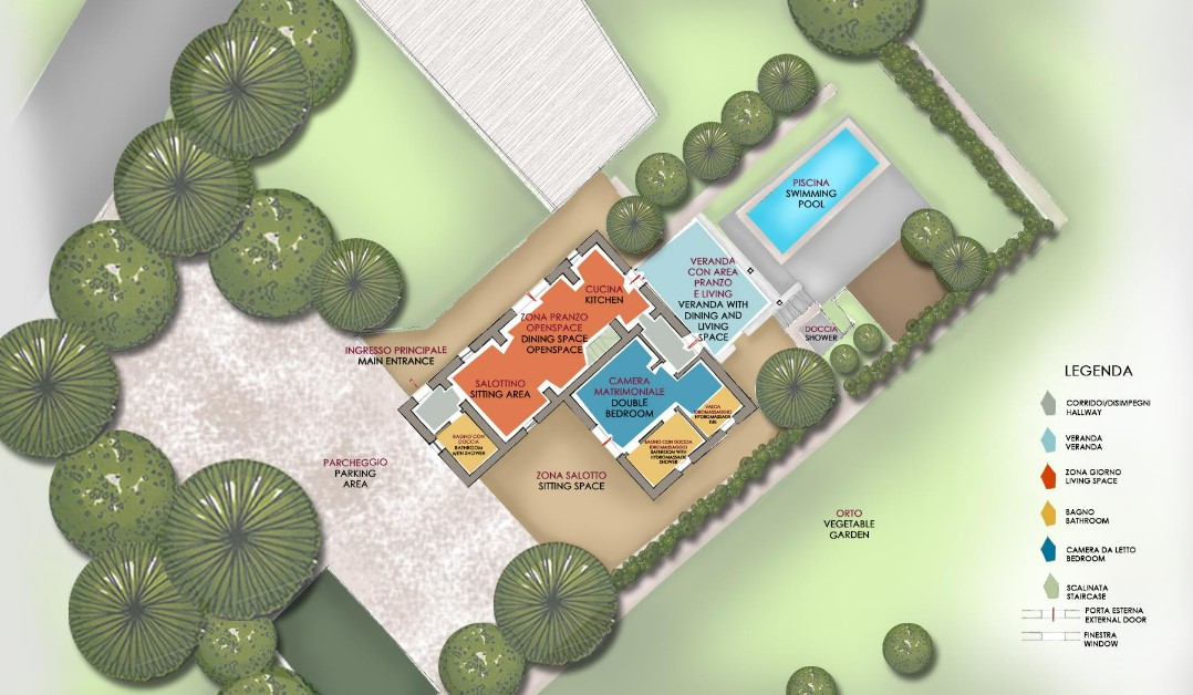The house has two floors. The entrance on the ground floor leads directly into the living area with lounge, dining area and full equipped kitchen forming a single open space, connected by a French window to the veranda with the outdoor dining and seating area. The floor is completed by a bathroom with shower and laundry area, a double bedroom with king size bed and amazing hydro-massage bathtub in view (equipped with aroma and chromo therapy), served by a bathroom with hydro-massage shower with chromo therapy and radio. The French door in the bedroom opens to a small outdoor sitting area with two chairs and a table. A wooden staircase leads up to the first floor composed of a double bedroom with en suite toilet.