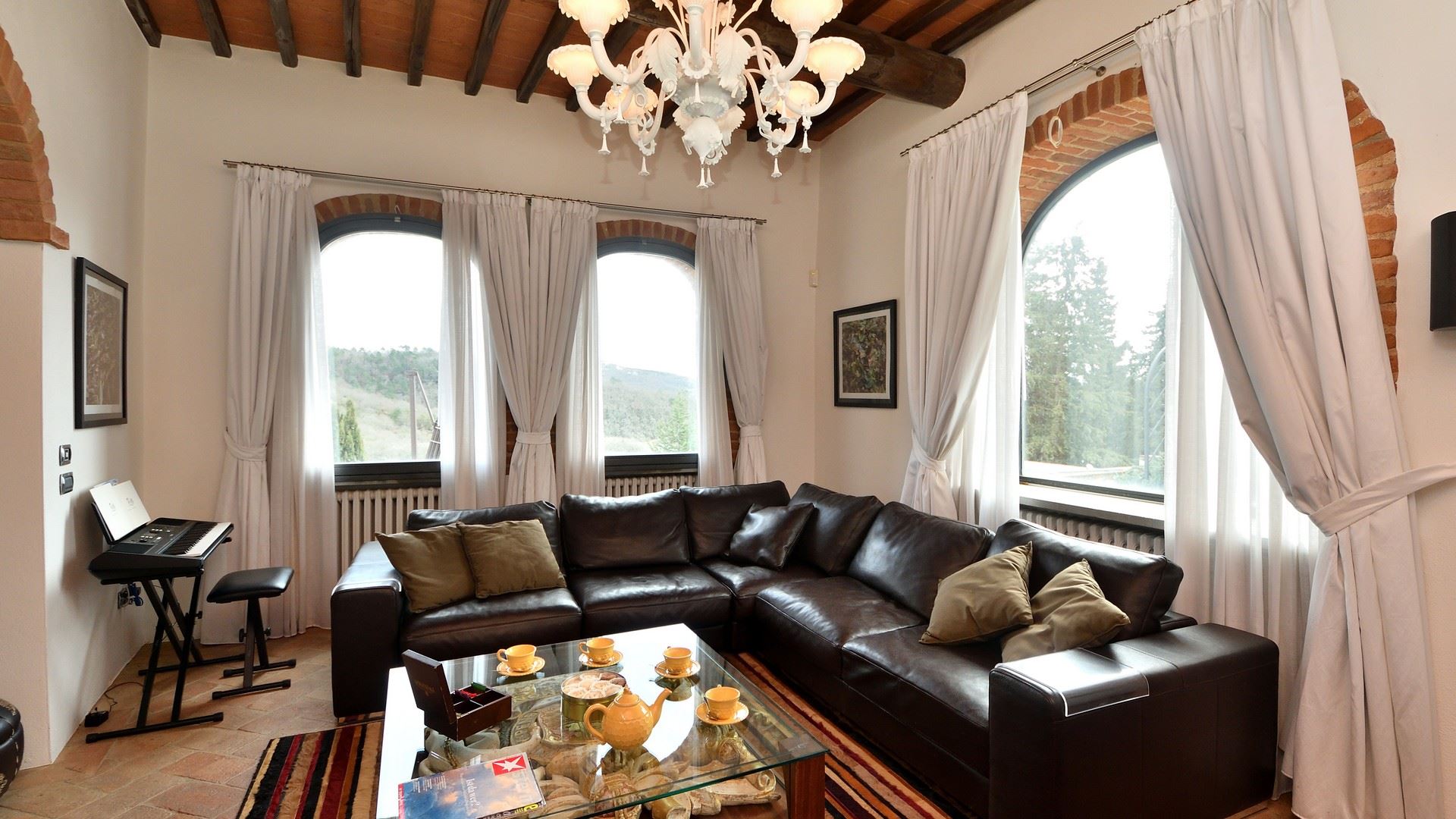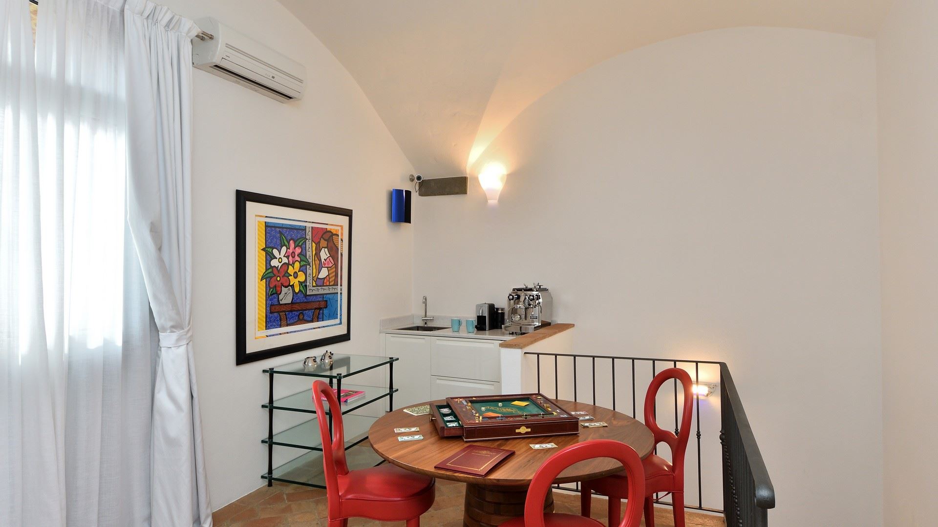 Sofa, armchair, coffee table, sink, coffee machine, table and chairs, side table, stairs to the ground floor bedroom 3, and separate staircase to the entrance, air conditioning.