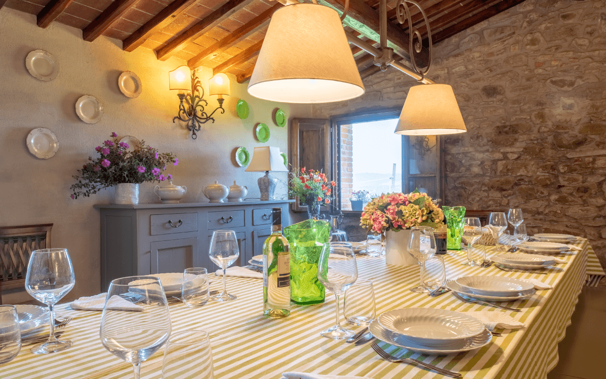The living room is paved with Tuscan terracotta tiles. The ceiling has characteristic exposed wood beams. The furnishings are classic and welcoming. The furnishings include two sofas, armchairs and a desk. There is an age-old and impressive fireplace. From the living room you will be able to enter the garden through two French doors. The room also has four windows. It is equipped with an air conditioning/heating unit.