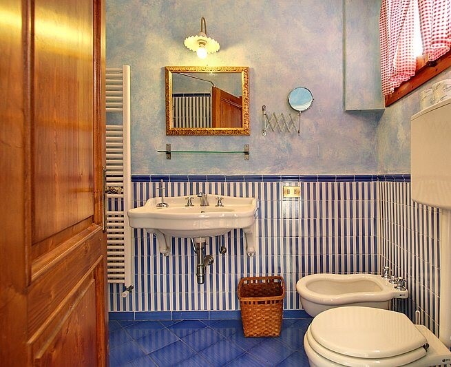 You will be able to enter the second bedroom from the corridor. The bedroom has a matrimonial bed (160 cm/63 inches, wider than a queen-size bed) and a single bed (80 cm/32 inches). From the bedroom you will be able to enter the terrace through a French door. The room has a window. This bedroom has an en-suite bathroom, tiled with lucid blue majolica tiles and equipped with a washbasin, a toilet and a shower.