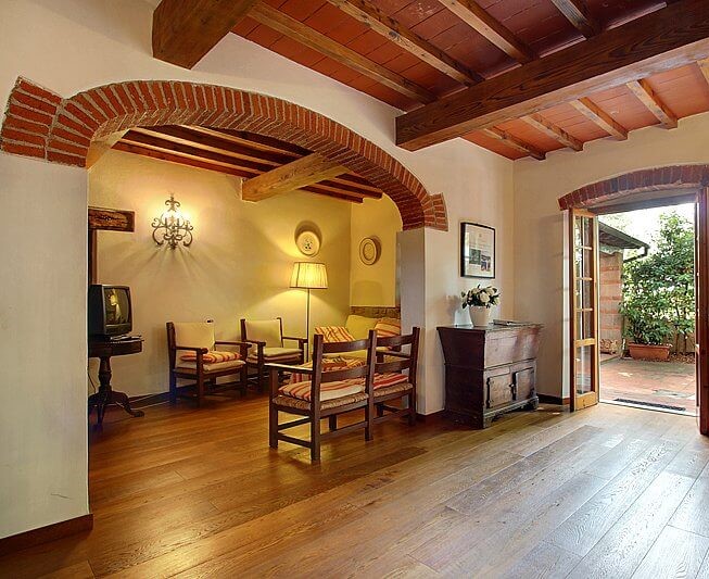 The living room is paved with wood. The furnishings are cozy and comfortable. The furnishings include a sofa and two armchairs. There is a big and age-old fireplace. In this room you will find a flat-screen satellite television (local channels). The room has a window with a view of the patio.