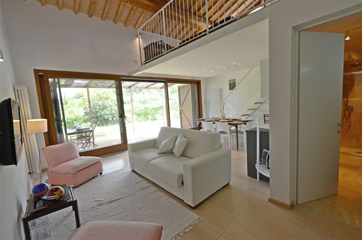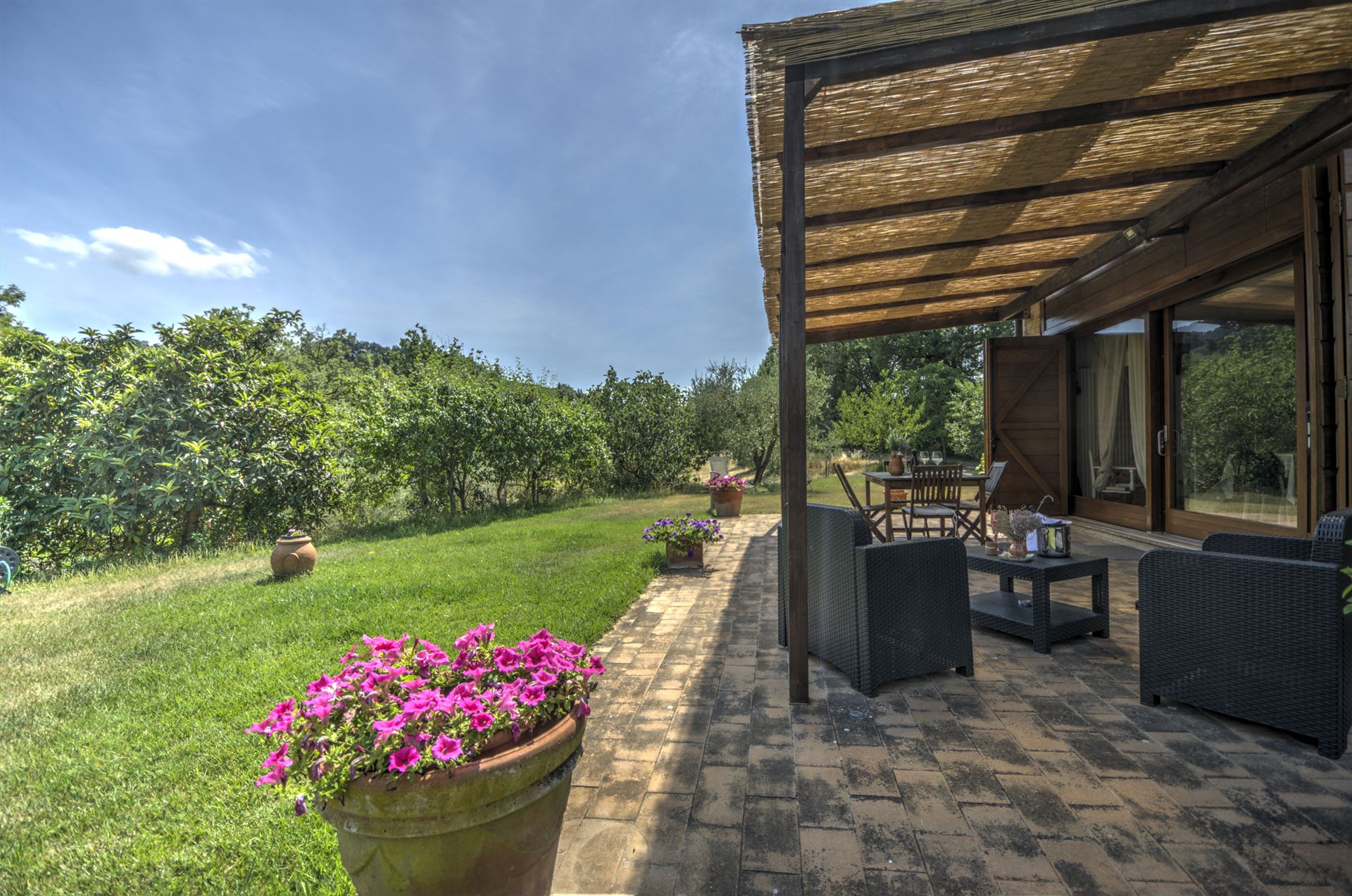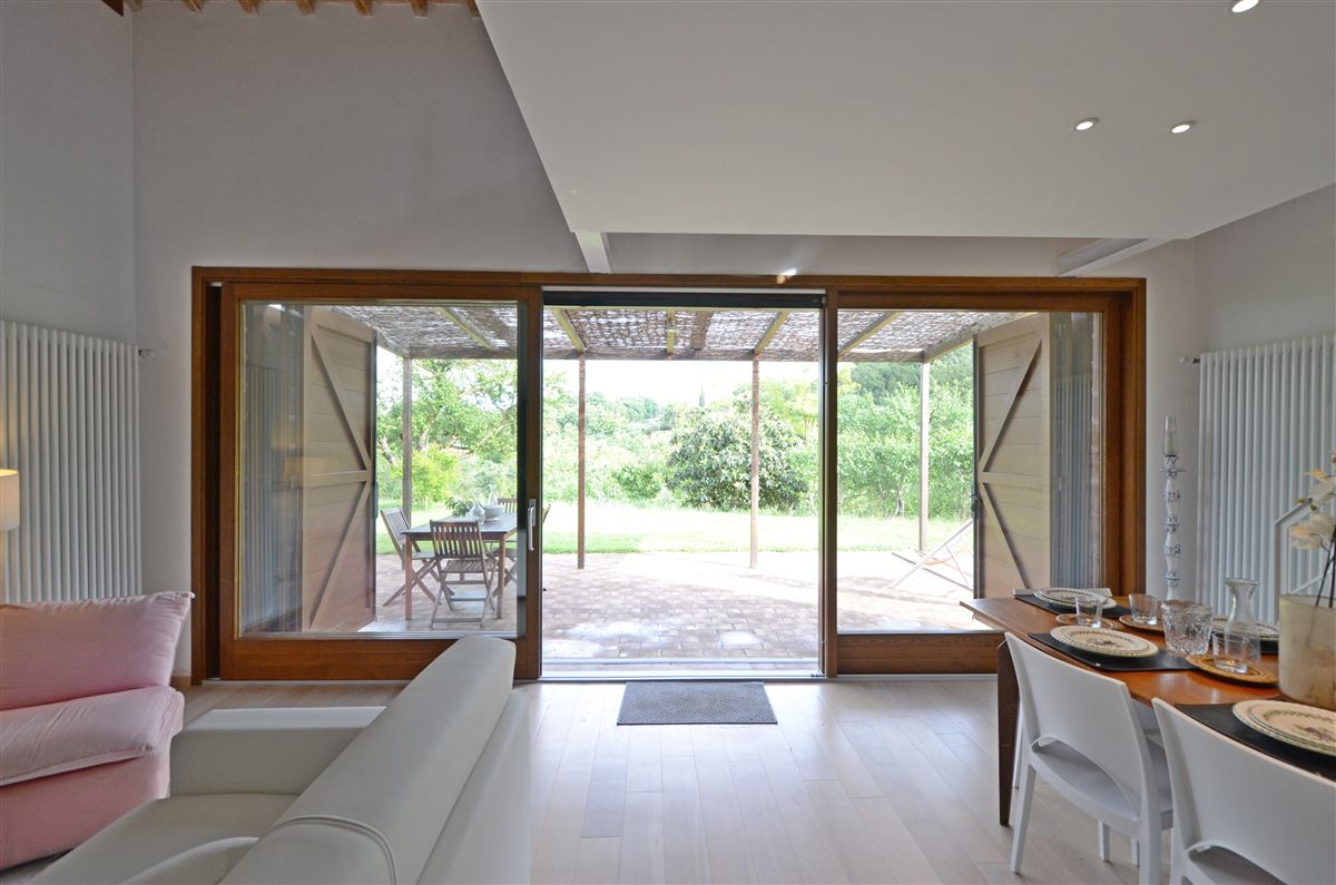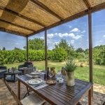 Inside, the villa combines traditional Tuscan style with modern, open-plan interiors. Wooden beam ceilings and terracotta floors are complemented by large glass sliding doors that let in natural light, creating a bright and airy atmosphere.