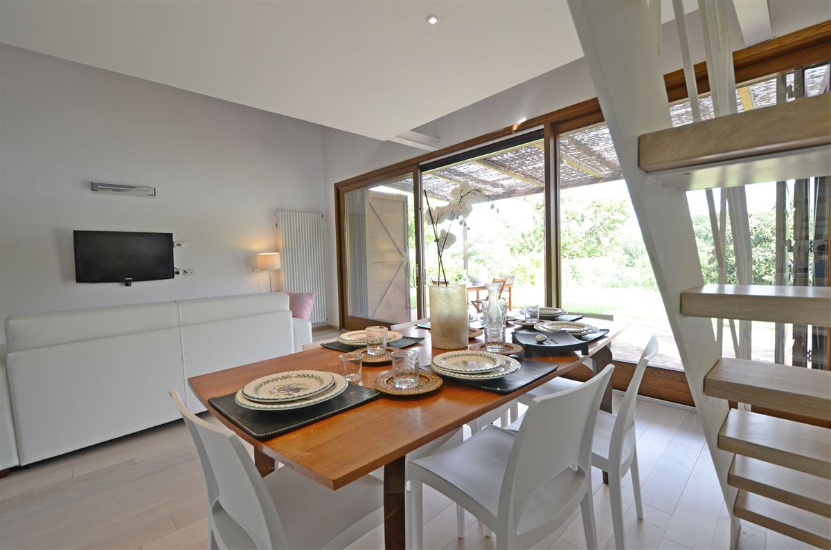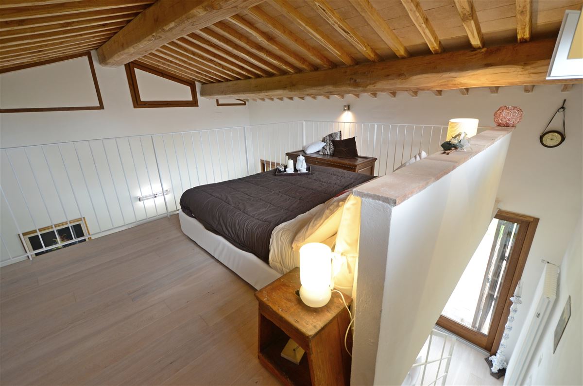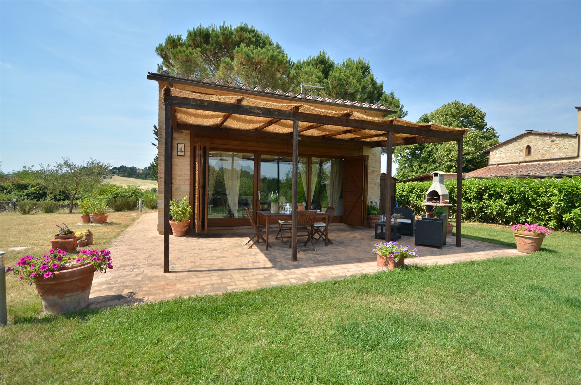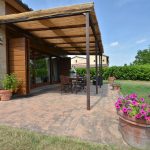 Inside, the villa combines traditional Tuscan style with modern, open-plan interiors. Wooden beam ceilings and terracotta floors are complemented by large glass sliding doors that let in natural light, creating a bright and airy atmosphere.