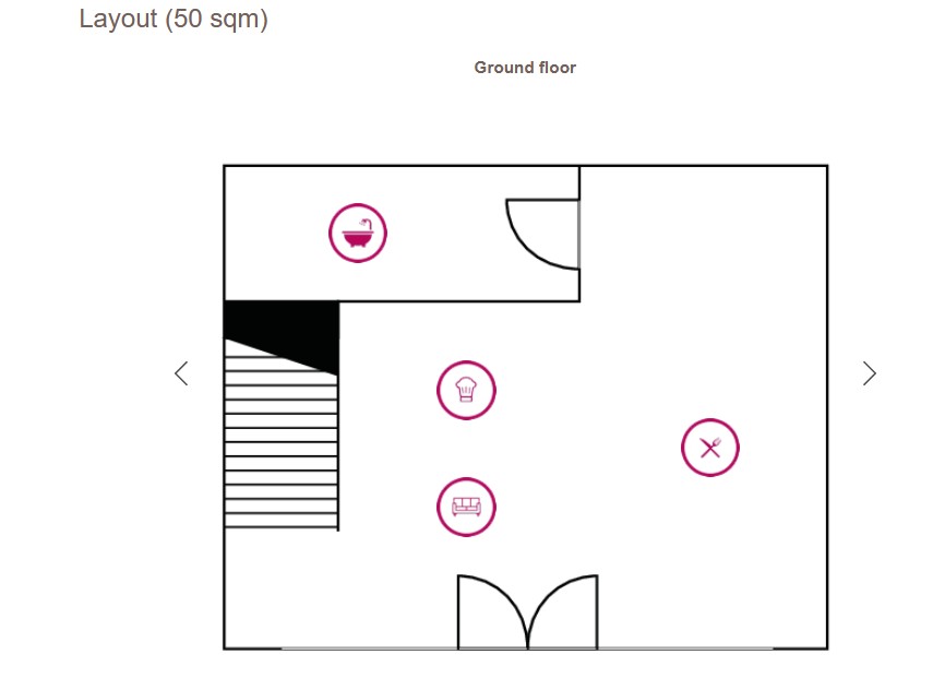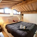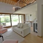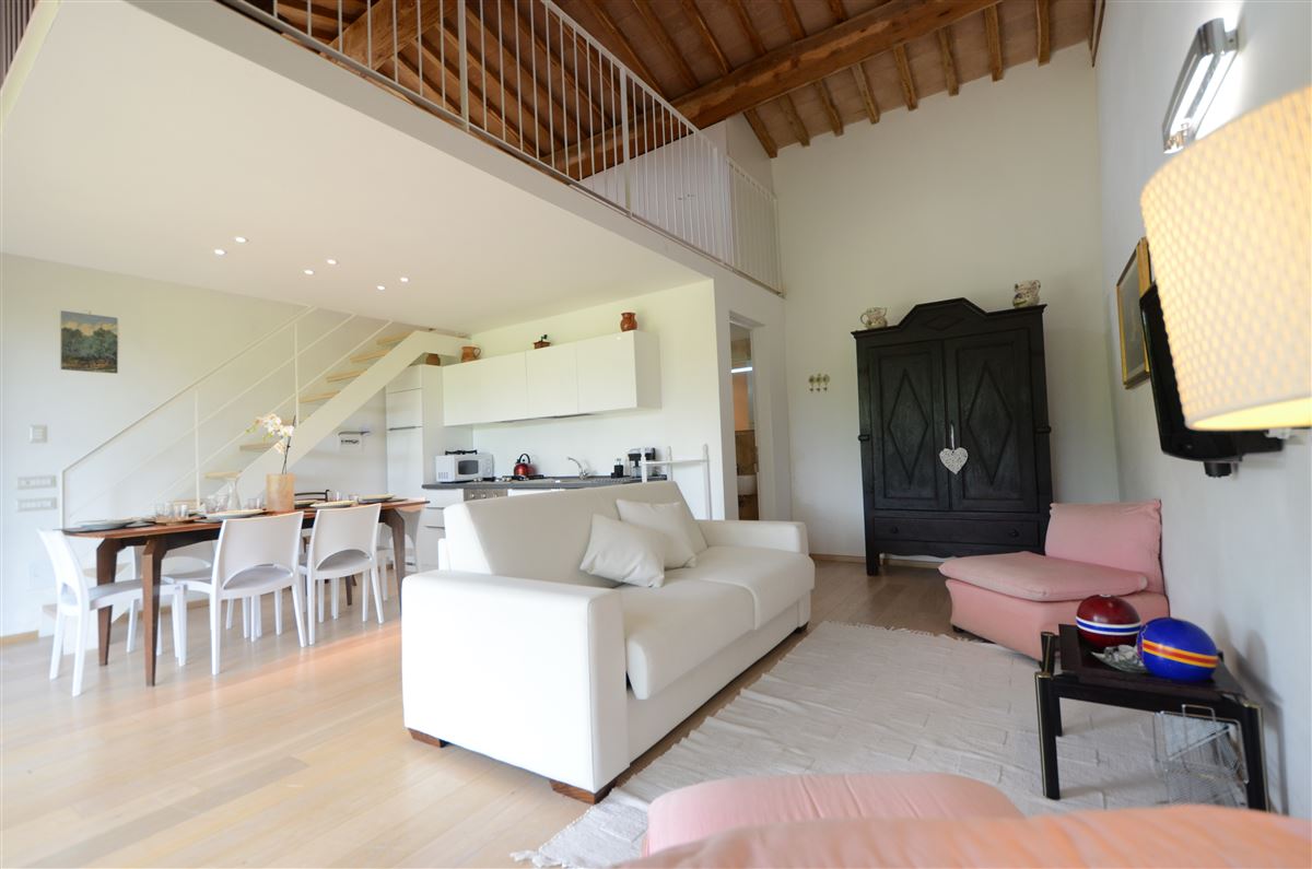Sofa, two armchairs, table with chairs, wardrobe, footstool, fully equipped kitchen, stairs to mezzanine, main entrance.