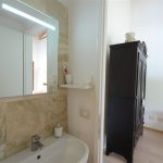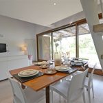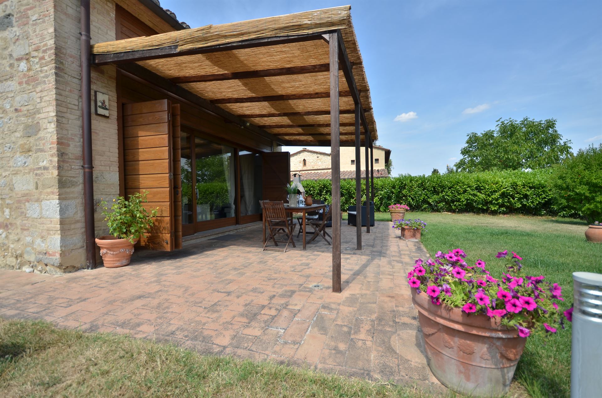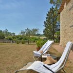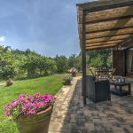 The villa’s exterior boasts a traditional stone structure, with a large shaded terrace perfect for outdoor dining or relaxing. The terrace features a dining table and an electric grill, allowing guests to enjoy meals while taking in the peaceful surroundings. The garden is beautifully maintained, with blooming terracotta pots adding to the charm.