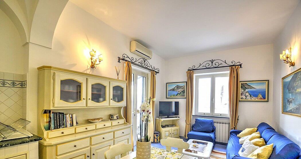 The living room is paved with handmade majolica tiles, in the characteristic style of the Amalfi Coast. The ceiling is vaulted. The furnishings are elegant and bright. The furnishings include an armchair and a divan bed for one guest. In the living room you will also find a cooking area. The kitchenette is equipped with a four-burner gas cooker, an electric oven, a refrigerator with freezer, a dishwasher and an Italian-style coffee-maker. There is also a washing machine, an iron and an ironing board. The dining table can accommodate six guests. In this room you will find a satellite television (local channels). From the living room you will be able to enter the terrace with a view of the sea through a French door. The room also has a window with a view of the sea. It is equipped with an air conditioning/heating unit.