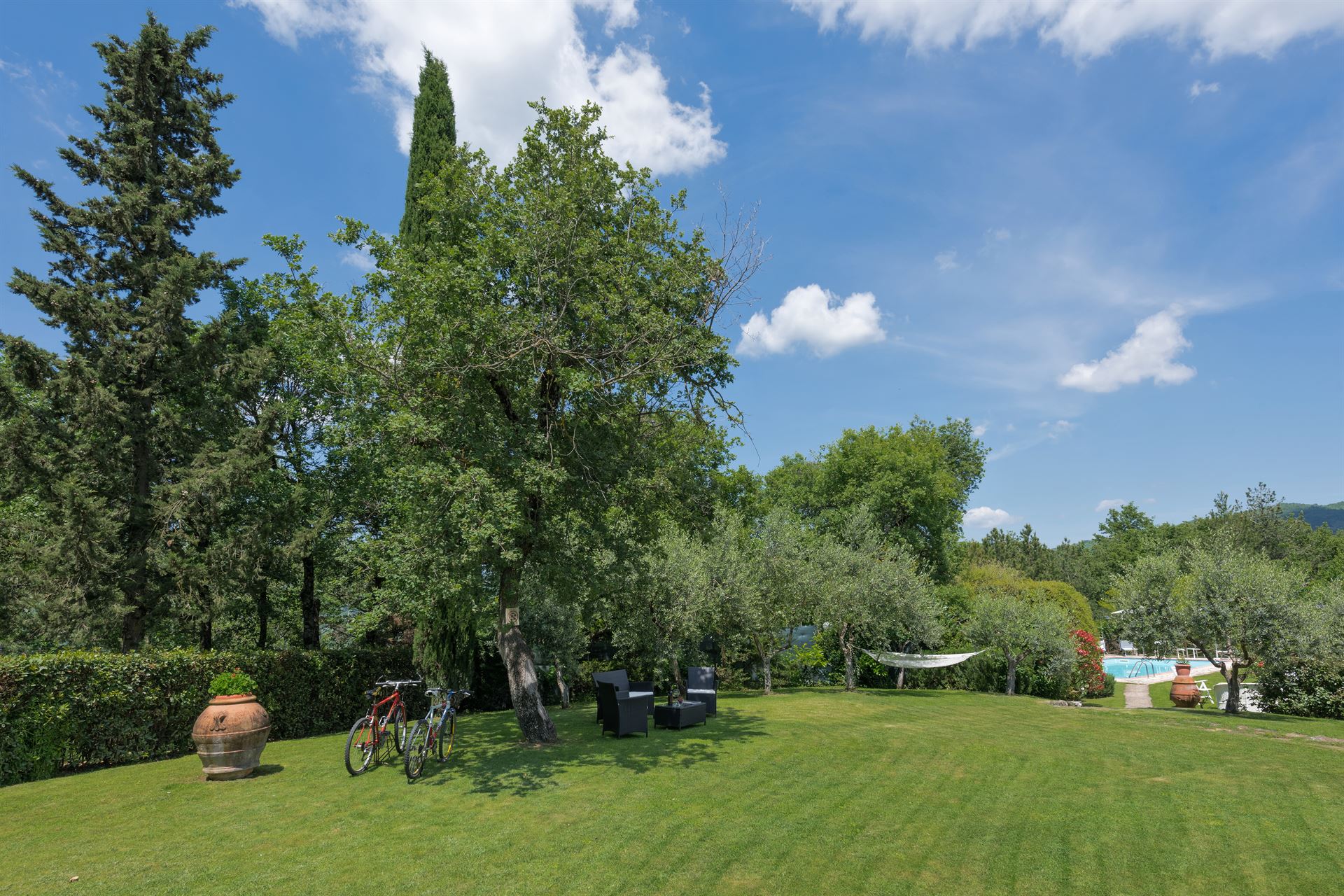 Take a stroll outside, along the furnished terracotta terrace that runs around two sides of the property: you’ll first discover a rattan sofa and chairs but walk a little further and you will reach a delightful al fresco dining spot with a table set beneath an iron pergola. A few steps away, in the garden awaits a further dining table with benches, shaded by the trees. There are more chairs (and a hammock) to relax in on the lawn and maximise your time in this special garden, as well as the private pool only 15 metres from the villa. The 5X10m swimming with pool furniture is an ideal way to just relax after a day exploring the Tuscan villages.